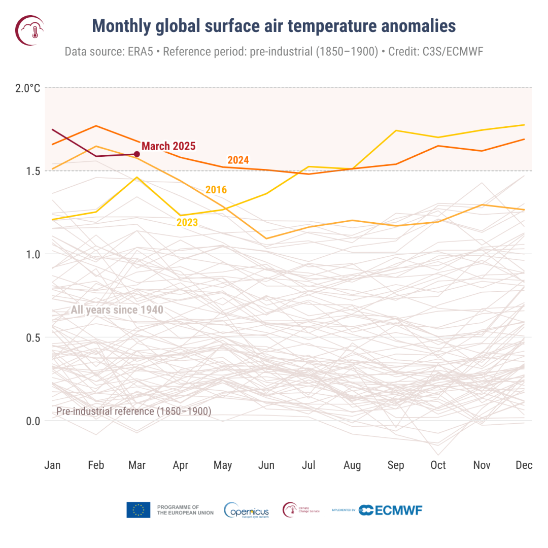 «Середня температура повітря на поверхні становила 14,06°C, що на 0,65°C вище середнього показника 1991-2020 років і на 1,60°C вище доіндустріального рівня березня», – заявили в C3S.Крім цього, березень 2025 року став 20-м місяцем за останній 21 місяць, коли середньосвітова температура повітря на поверхні планети була більш ніж на 1,5 °C вище доіндустріального рівня.