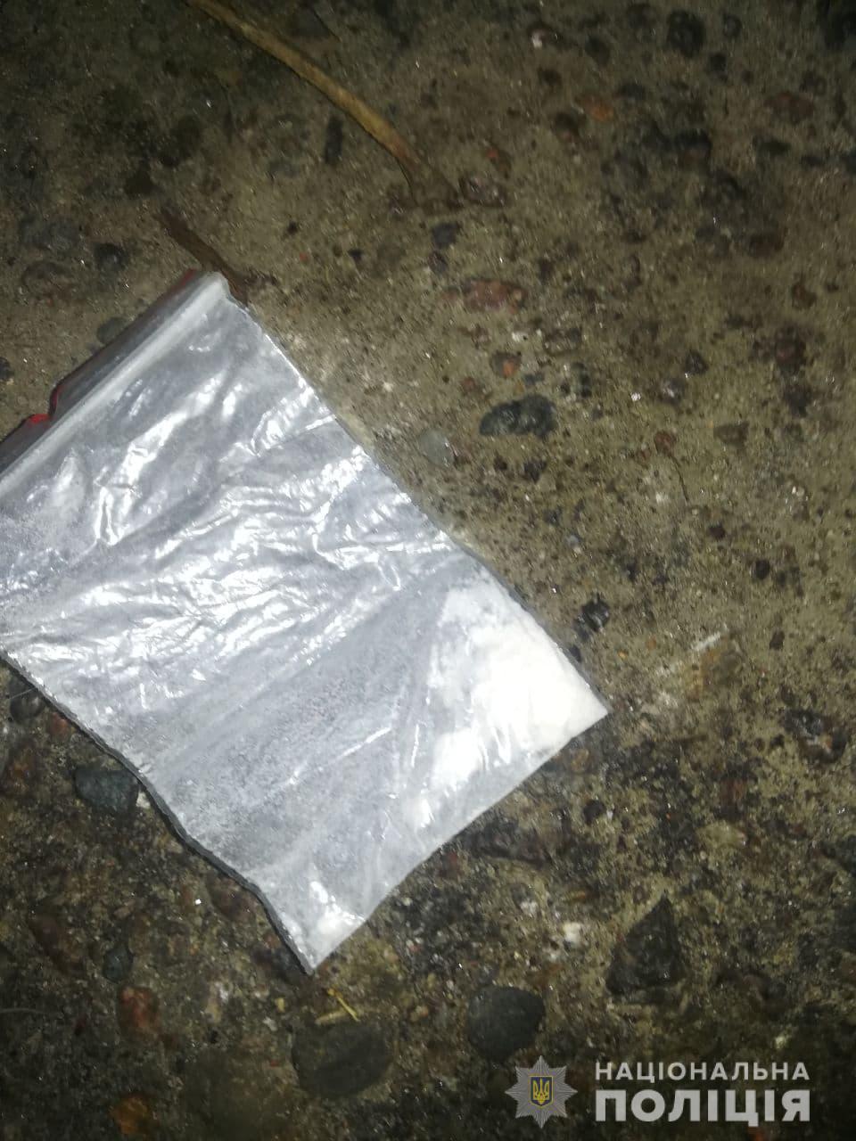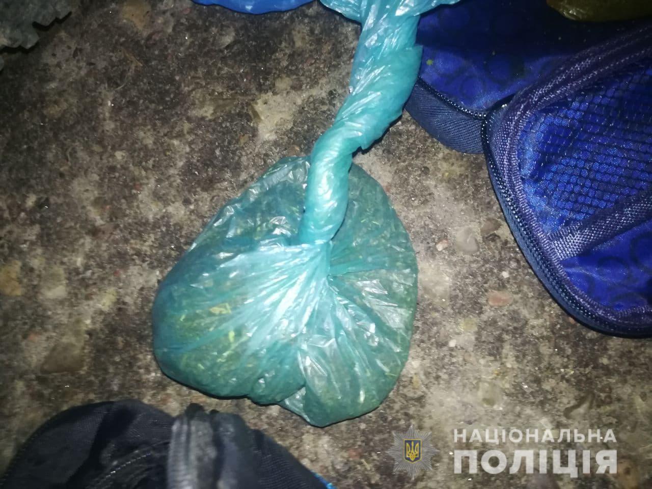 Слідчо-оперативна група, виїхавши на місце події, вилучила у громадянина поліетиленові пакети вагою близько 180 г з речовиною рослинного походження, схожою на канабіс, згорток та пакетик з порошкоподібною речовиною, зовні схожою на амфетамін.