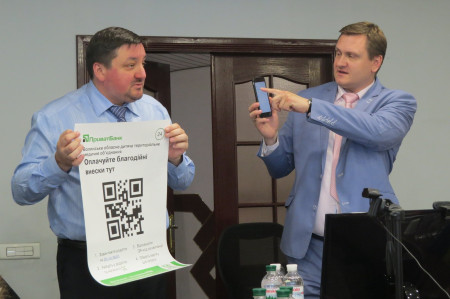 «Круто, швидко, технологічно», – це не пафосні слова директора Північно-Західного регіонального управління ПриватБанку Юрія Войтенка про розрахунок за послуги чи товари за допомогою QR-коду, а справедлива констатація факту. На підтвердження, заручившись підтримкою свого колеги, керівника напрямку платежів і переказів Олександра Нерука, чоловіки демонструють як за допомогою буквально одного пальця і смартфону, можна переказати благодійний внесок на адресу Волинського обласного територіального медичного об'єднання.