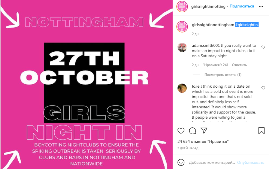 Після низки таких випадків студентки в Ноттінгемі, Единбурзі, Брістолі та Ексетері організували кампанію #girlsnightin та оголосили бойкот нічних клубів по всій Великобританії, закликаючи заклади посилити контроль на вході та безпеку загалом.«Ми заслуговуємо на розваги. Це нечесно, що наші походи у клуб заплямовані страхом та тривогою, що нам можуть закидати наркотики», – йдеться у повідомленні.