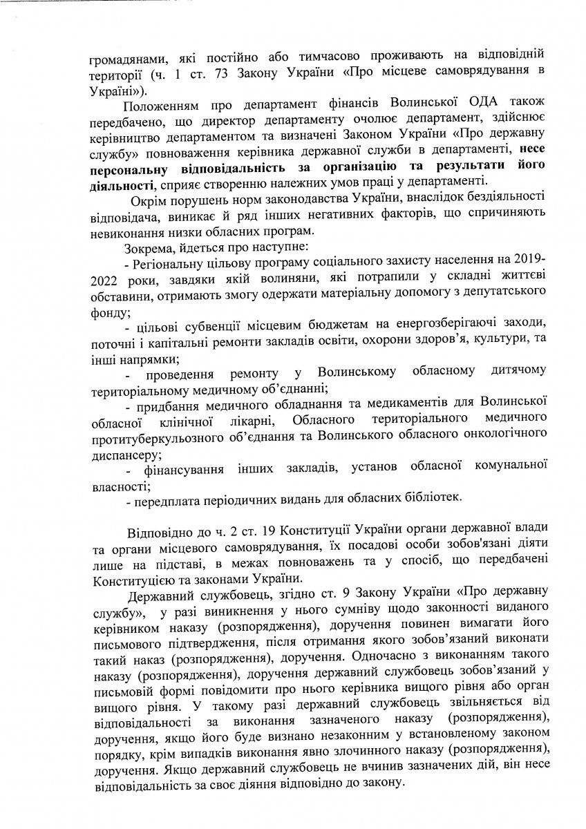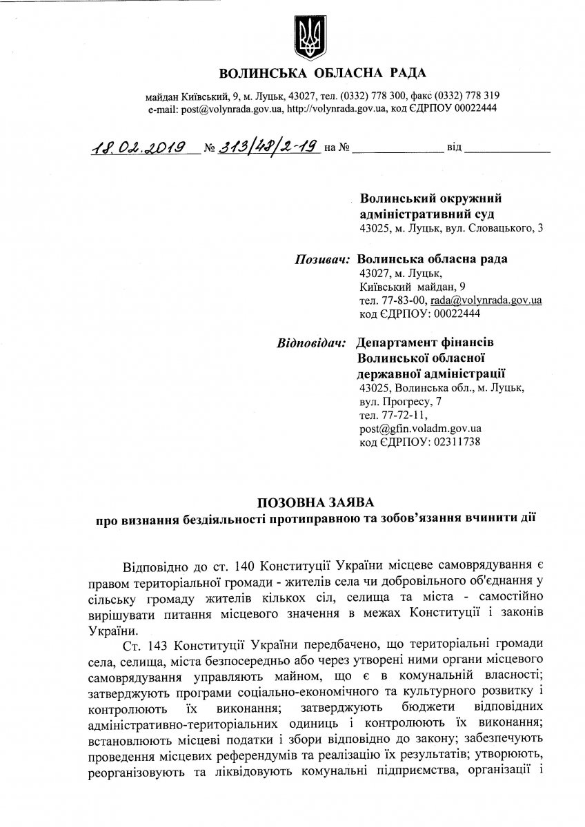 Від Волинської обласної ради за підписом керуючого справами виконавчого апарату обласної ради Дмитра Дубняка 18 лютого подали заяву до Волинського окружного адміністративного суду щодо діяльності департаменту фінансів ОДА, йдеться на сайті облради.