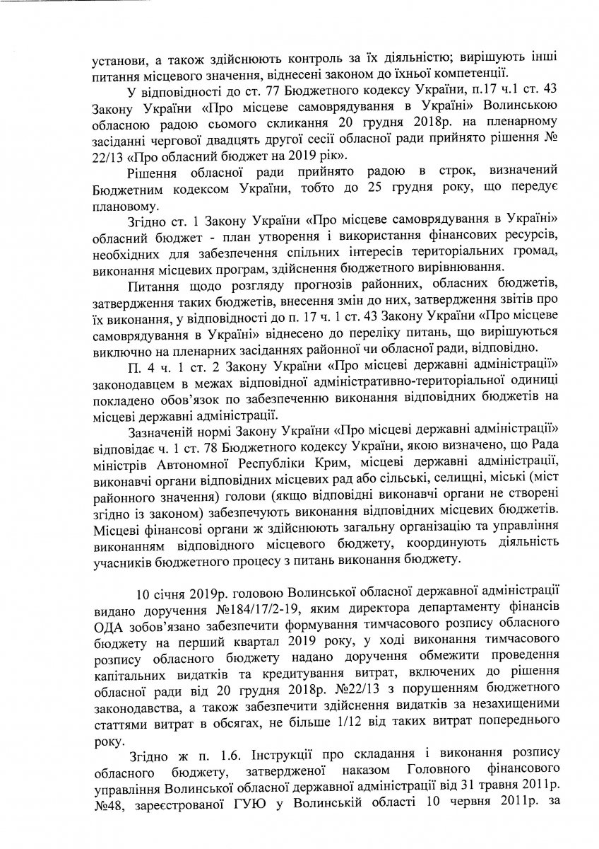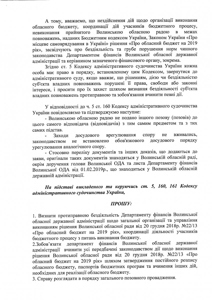 У заяві просять визнати бездіяльність Волинської ОДА протиправною. Йдеться про загальну організацію бюджетного процесу та виконання обласного бюджету.