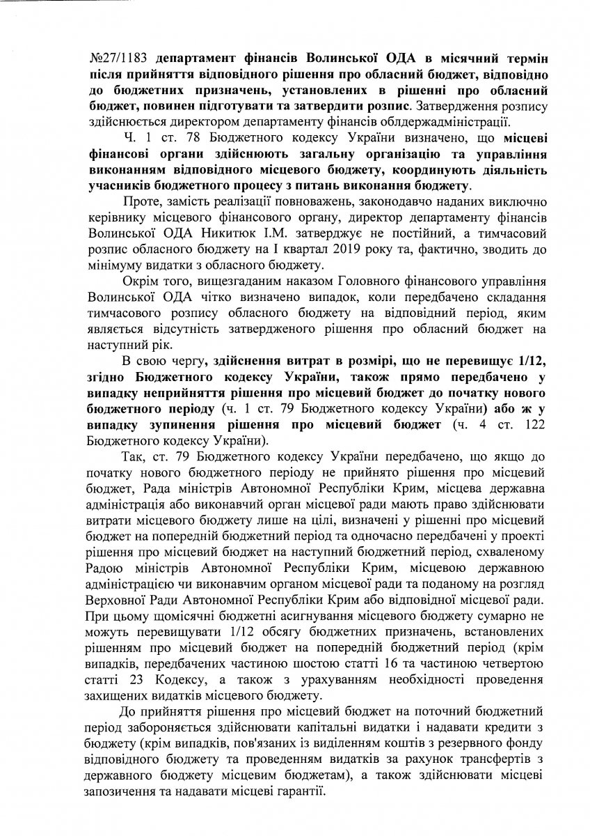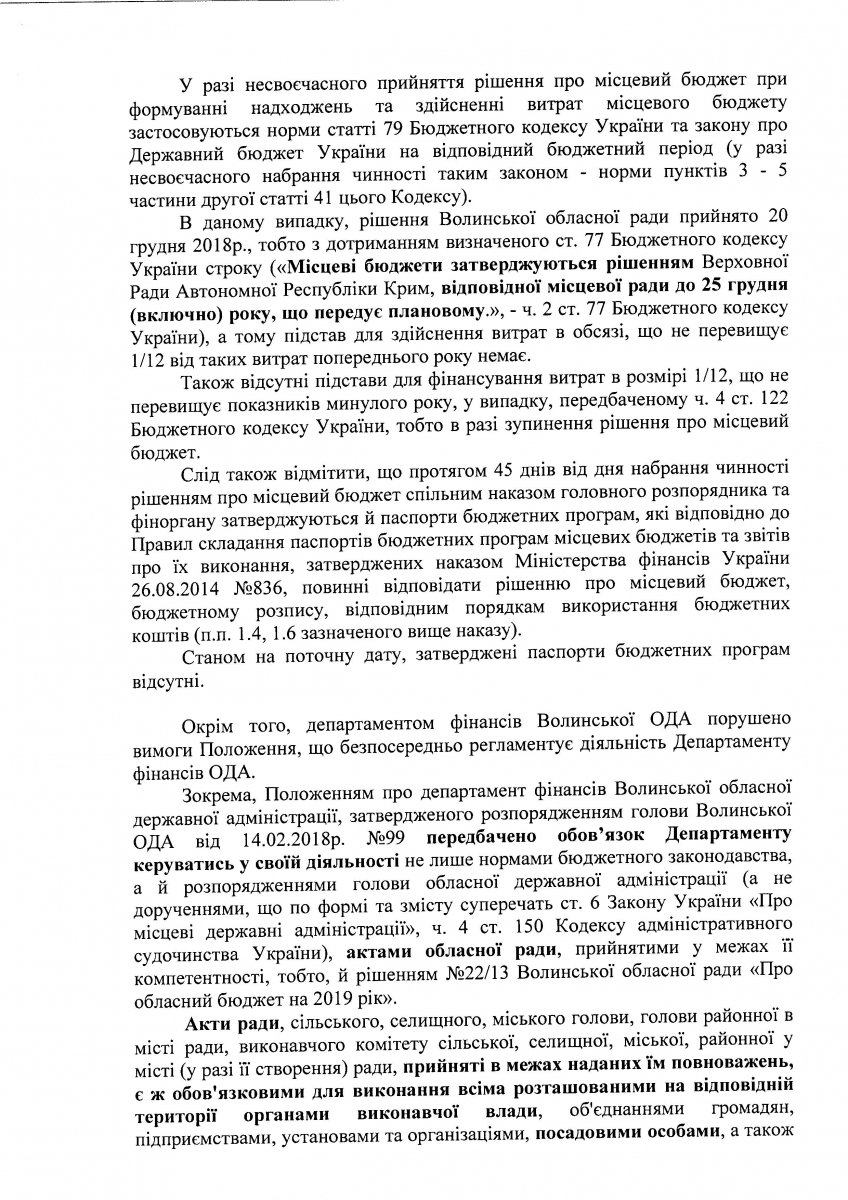 Окрім того, Волинський окружний адміністративний суд не задовольнив заяву Волинської обласної державної адміністрації до Волинської обласної ради про визнання протиправним та скасування рішення від 20.12.2018 року №22/13 «Про обласний бюджет на 2019 рік». Однак, такого аргументу для виконавчої влади, як виявилося не достатньо, - область продовжує жити за тимчасовим розписом обласного бюджету.