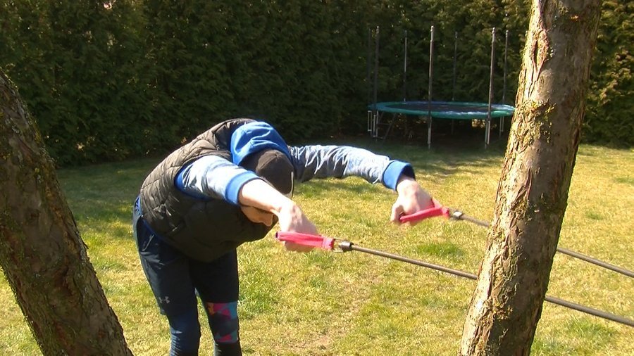 Один із способів тренувати руки – це махи з натягнутими резинками, які зафіксовані до опори, розповідає 16-річний майстер спорту Максим Ткачук. Він показує, які можна проводити тренування, створюючи імітацію опору води.