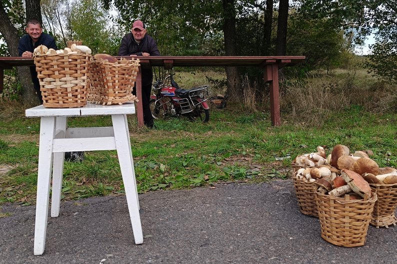 Подружжя Сидоруків за кілька годин назбирали два кошики білих та боровиків неподалік села. Зі слів Миколи Сидорука – пенсіонера, колишнього вчителя, у кожного місцевого є свої грибні місця. Усі шукають перші трофеї в низовині, де більше вологи.У першу чергу перевіряють місця серед моху та вересу. У нього є прикмета: якщо в лісі багато мухоморів, то це значить, що і білі гриби повинні бути.