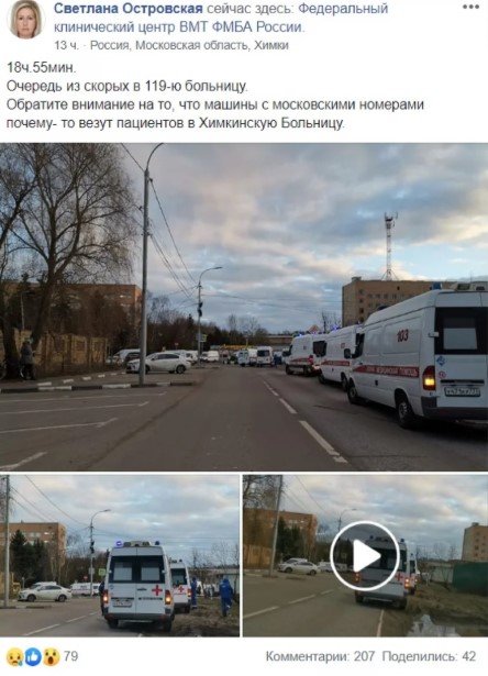 У коментарях до цих фотографій інші користувачі також публікують аналогічні відео та фото.Скріншот закритої публікації у ФБ / Фото: Я проти нового терміну мера Собяніна / FacebookА мешканка Москви Надія Зубакова оприлюднила відео, яке зняв її однокласник, що працює фельдшером на «швидкій допомозі» в російській столиці.Чоловік, який знімав відео з кабіни «швидкої», розповідає, що медики прямували в «третій госпіталь ветеранів» (шпиталь для ветеранів воєн № 3 в Москві). Однак прилеглі до медичної установи вулиці виявилися буквально заповнені чергою зі «швидких».