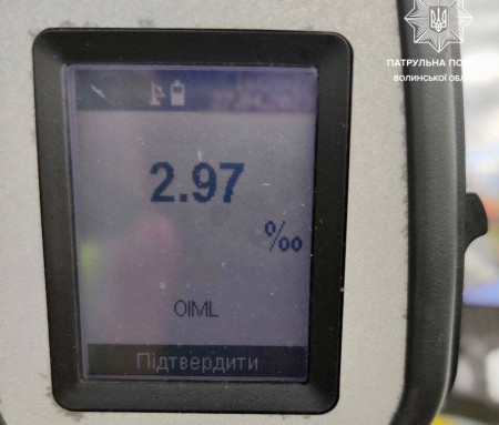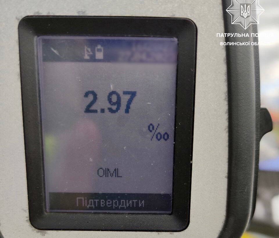 Неподалік Луцька виявили водія у стані алкогольного сп’яніння. Прилад Drager показав результат - 2, 97 проміле, що перевищує допустиму норму у 15 разів.