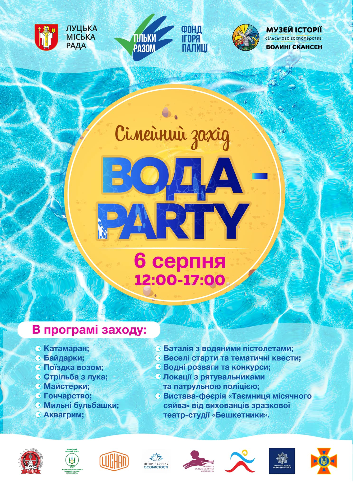 У програмі – низка цікавих атракцій: катамаран, байдарки, мильні бульбашки, водні розваги та конкурси, стрільба з лука, майстерки, аквагрим, баталія з водними пістолетами, веселі старти та тематичні квести, гончарство, поїздка возом, вистава-феєрія «Таємниця місячного сяйва» від вихованці зразкової театр-студії «Бешкетники», зона харчування. Захід відбудеться 6 серпня 2022 року з 12:00 до 17:00 на території Музею історії сільського господарства Волині – скансену (вулиця Шкільна, 1, село Рокині, Волинська область). Вхід вільний.Читати ще: «Коли ми сильні духом, ми сильні й фізично»: у День батька поблизу Луцька провели сімейне свято