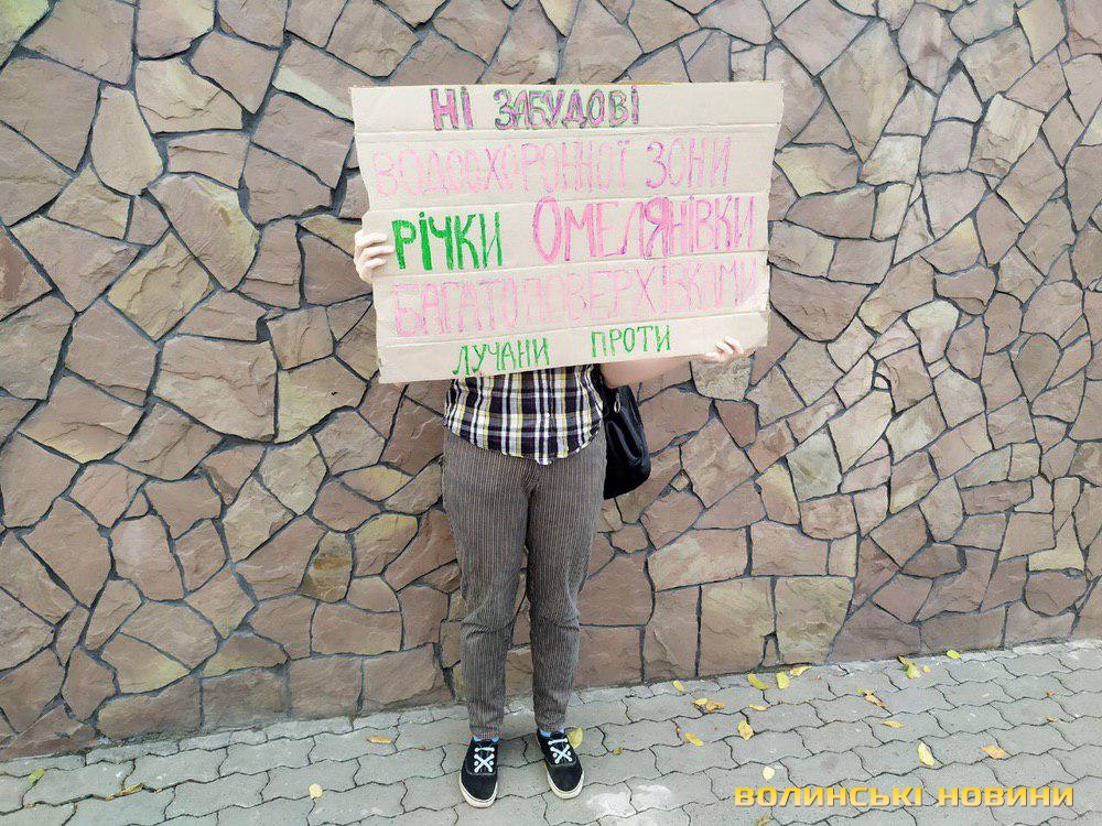 Поблизу Луцької міської ради зібралися люди, які протестують проти будівництва трьох багатоповерхівок поблизу водоохоронної річки Омелянівки.