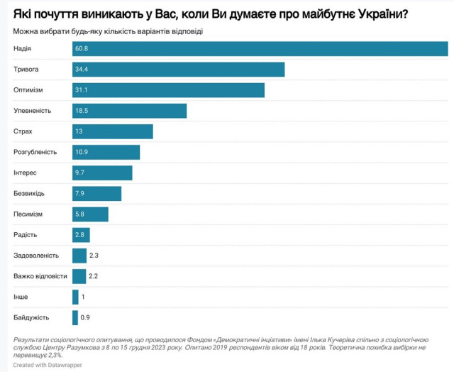 За словами експерта, почуття, які превалюють у громадській думці щодо майбутнього України, – це надія (60,8% опитаних), натомість 34,4% опитаних відчувають тривогу.