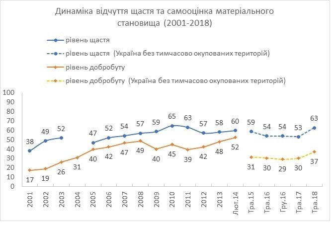 Також щасливішими є ті, у кого вищий рівень добробуту. Так, серед найбідніших (ті, кому не вистачає на їжу) щасливими себе назвали 40%, серед малозабезпечених (вистачає лише на їжу) таких 58%, серед людей із середнім прибутком (вистачає на їжу, одяг і є що відкласти) – 74%, серед людей із прибутком вищим за середній (можуть купувати дорогі речі) – 85%.Також щасливими себе почувають ті, у кого міцне здоров'я (88%).