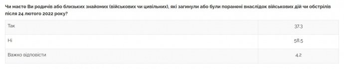 Дослідники ставили респондентам запитання: Чи маєте Ви родичів або близьких знайомих (військових чи цивільних), які загинули або були поранені внаслідок військових дій чи обстрілів після 24 лютого 2022 року?