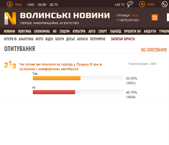 Так, респондентам поставили питання, чи готові вони платити за проїзд у Луцьку вісім гривень в сучасних і комфортних автобусах. Загалом у голосуванні взяло участь 3435 людей, 1604 (46,70%) з яких відповіли, що не готові до підвищення вартості проїзду. Однак 1831 (53,30%) проголосували за те, що готові до підвищення вартості проїзду, якщо на маршрутах будуть сучасні автобуси.Зазначимо, що відповідно до статистики щодо вартості проїзду в громадському транспорті в містах станом на кінець червня 2021 року, в середньому мешканці обласних центрів сплачують за проїзд в автобусі вісім гривень, а за проїзд у тролейбусі – шість гривень.