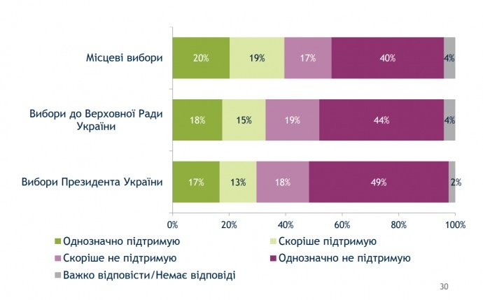 Щодо виборів до Верховної Ради, то 33% респондентів – за їх проведення під час війни, (18% – однозначно так, 15% – скоріше); 63% не підтримують (44% однозначно проти, 19% – скоріше ні).