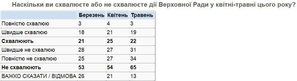 Дії Верховної Ради не схвалили 65% респондентів (22% схвалили).