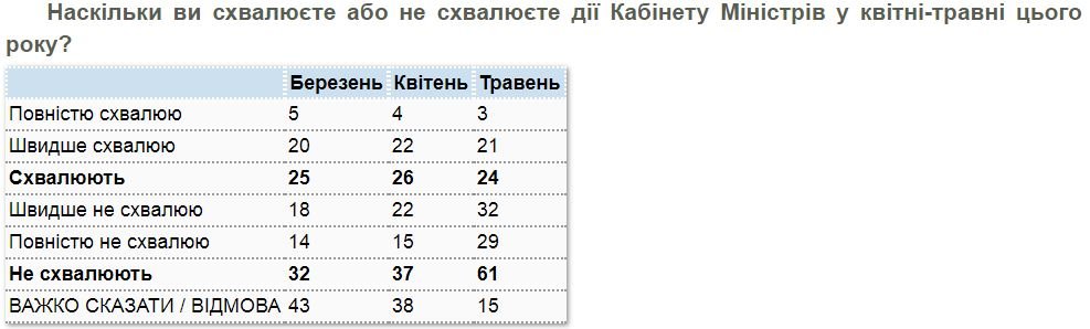 Водночас у березні і квітні задоволених діями Кабміну було більше – 25 і 26% відповідно.