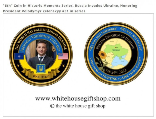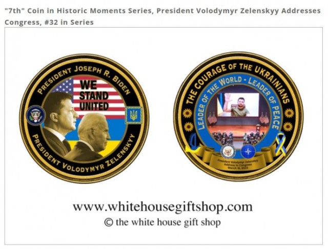 «Білий дім у сувенірному магазині презентував пам’ятну монету, присвячену історичному зверненню Володимира Зеленського до Конгресу США 7 березня 2022 року.