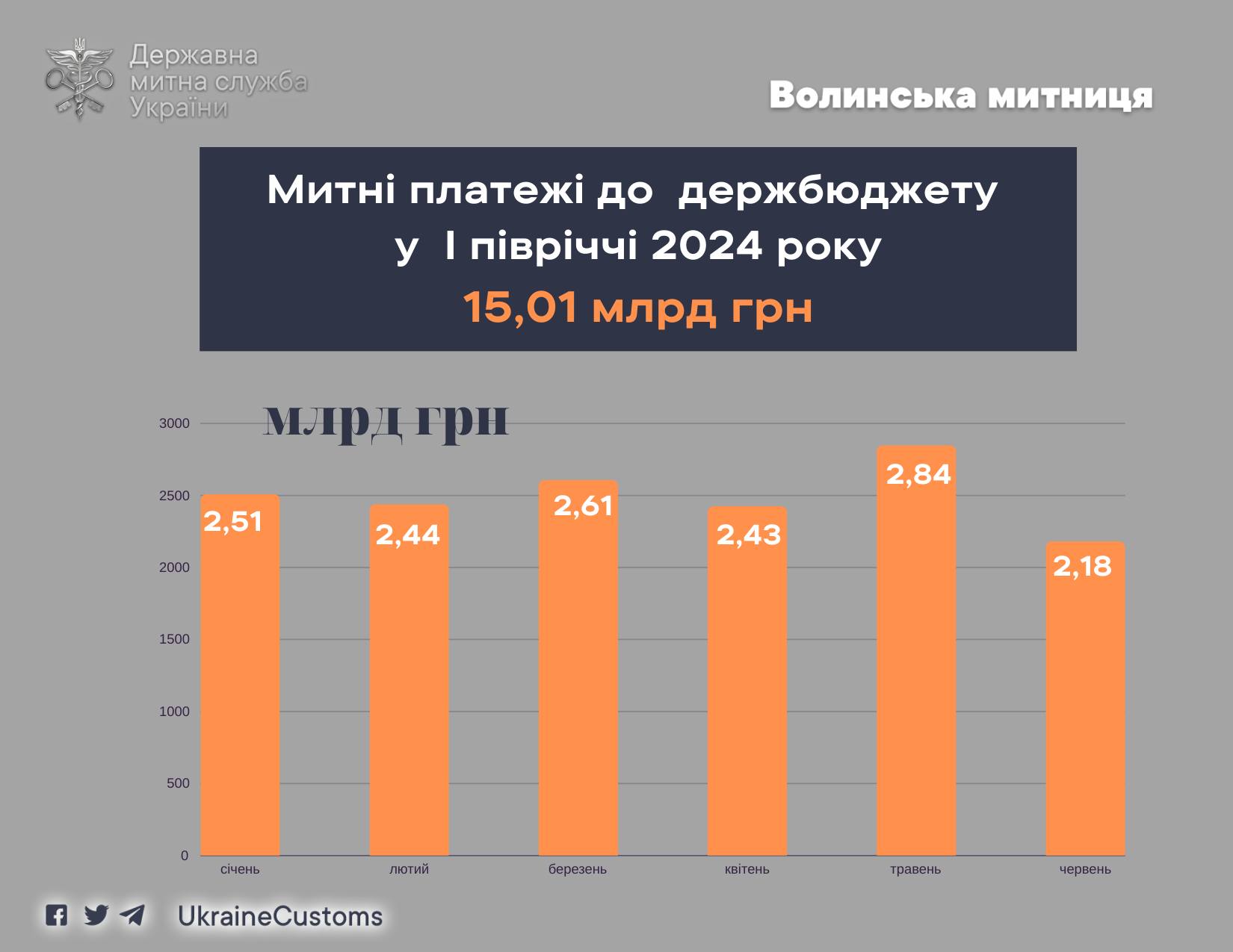 У січні-червні 2024 року Волинська митниця адмініструвала податків на загальну суму у 15010,8 млн грн. Їх сплатили до держбюджету понад 2 тисячі суб'єктів зовнішньоекономічної діяльності, які провадили активну міжнародну торгівлю.