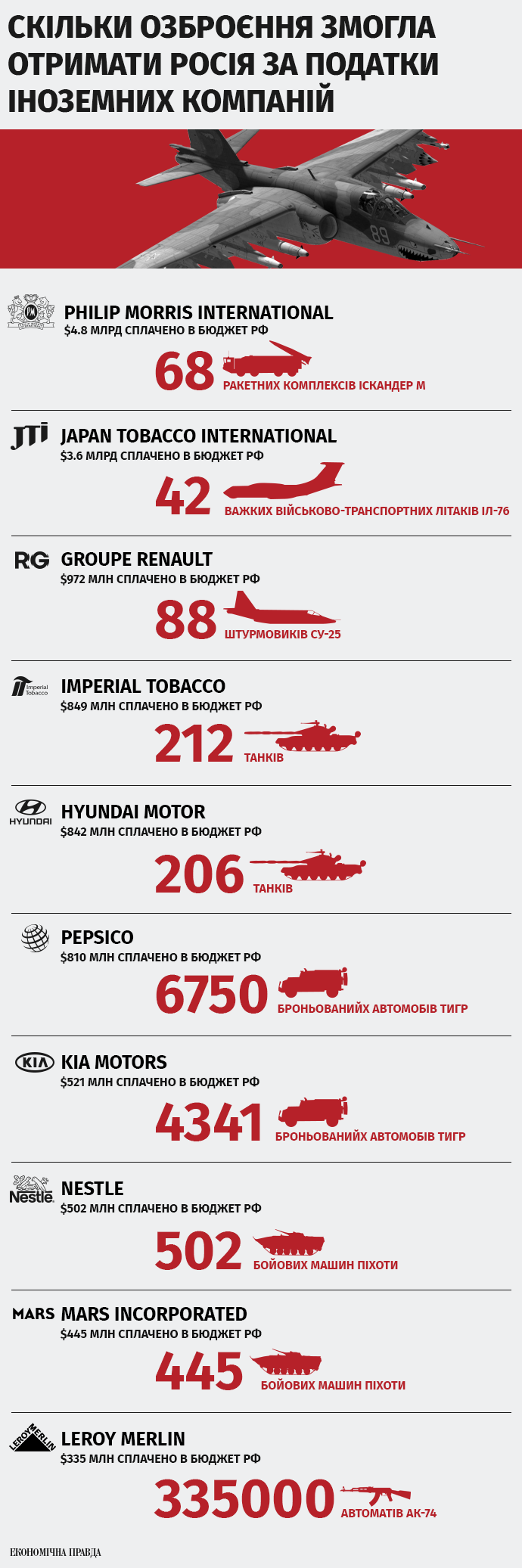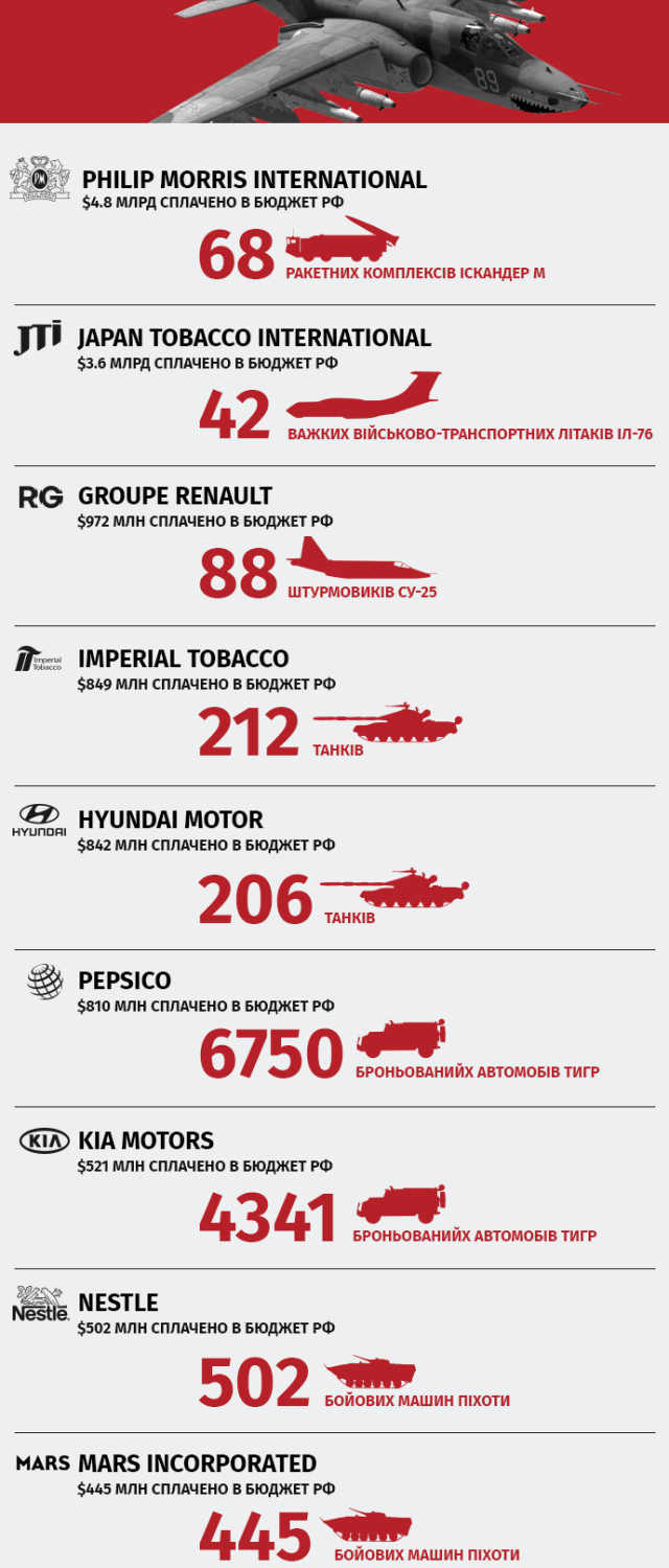 РФ витрачає на армію близько 15% держбюджету і ще більше – на підтримку диктаторського режиму. Отже, коли ці компанії сплачують податки в російський бюджет, вони фінансують її збройні сили та обстріли українських міст.