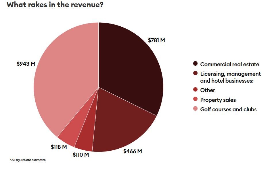 Найбільша частина доходів Трампа припадала на його клуби та майданчики для гольфу, які за чотири роки принесли приблизно $940 мільйонів. Йдеться насамперед про гольф-курорти Trump National Doral у Маямі, Мар-а-Лаго в Палм-Біч, а також гольф-клуб у Нью-Джерсі. Крім того, бізнес Трампа мав комерційні холдинги, які здавали приміщення й цілі комплекси в довгострокову оренду. Там гроші продовжували надходити навіть у період пандемії.Водночас прибуток приходив від готелів, ліцензійних компаній, а також менеджменту нерухомості. Хоча вони зазнали найбільшого удару від COVID-19, їхній прибуток оцінювався від $100 мільйонів у звичайні роки до $50 мільйонів у 2020-му.