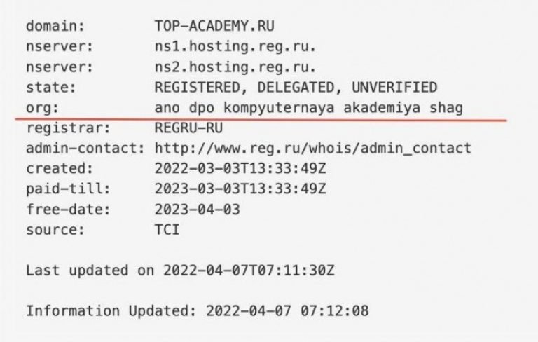 4. Власником сайту top-academy.ru станом на початок квітня залишається юридична особа АНО ДПО «Академия ШАГ». Вона володіє російською мережею із 17 представництв та 120 філій та належить ООО «Компьютерной академии ШАГ». 89,6% капіталу в останньому – у Дмитра Корчевського.Паралельно ТОВ «Компьютерная академия ШАГ» володіє 25% петербурзької компанії ТОВ «Академия ШАГ СПБ». Корчевський запевняє, що роль української компанії у співпраці з її представництвами обмежувалась наданням бренду, консультаціями з відкриття бізнесу, рекомендаціями з його ведення, іншими інформаційними та маркетинговими послугами. І жодних інвестицій у запуск бізнесу.