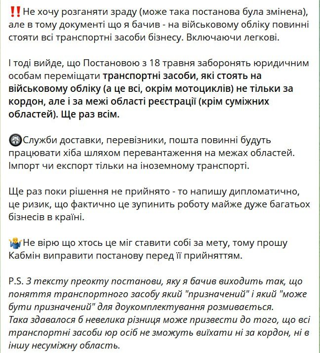 «У тому документі що я бачив – на військовому обліку повинні стояти всі транспортні засоби бізнесу. Включаючи легкові. І тоді вийде, що Постановою з 18 травня заборонять юридичним особам переміщати транспортні засоби, які стоять на військовому обліку (а це всі, окрім мотоциклів) не тільки за кордон, але і за межі області реєстрації (крім суміжних областей). Ще раз – всім», – написав у своєму Telegram народний депутат Ярослав Железняк.