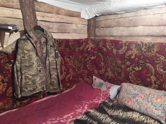 На двох чоловіки спорудили невеличкий, але дуже затишний бліндаж. Є тут і саморобні тапчани для спання, і колоритний ослінчик, і невеличкий столик, на стінах – полички із посудом, мильницями, щітками-пастами для чищення зубів тощо. Ну й, звісно, тутешня королева, її бліндажна величність – буржуйка!