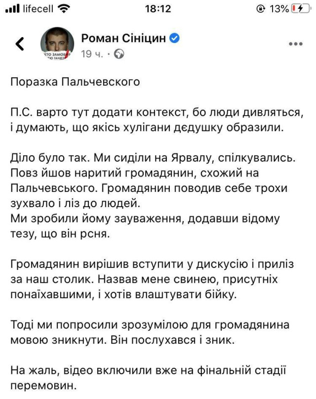 Я б не сказала, що Пальчевсьаий дуже п'яний. Ну, випивши... Хтось сам спровокував, а потім себе ж і зняв...
