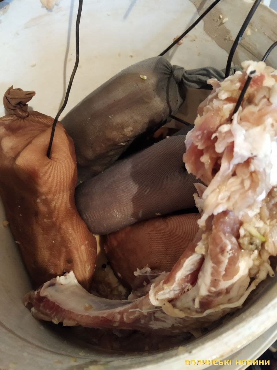 Його дістаємо у велику ємність. Перед тим як дістати бочок із коптильні, у великій посудині кип’ятимо воду – аби туди можна було помістити все копчення, яке ми дістали з бочки. Закладаємо його туди і проварюємо 30-40 хвилин, не розмотуючи з марлі чи не виймаючи з панчохи. Просто з гачками. Після цього страву дістаємо за гачки і знову поміщаємо до коптильні на 30-40 хвилин, але не довше!