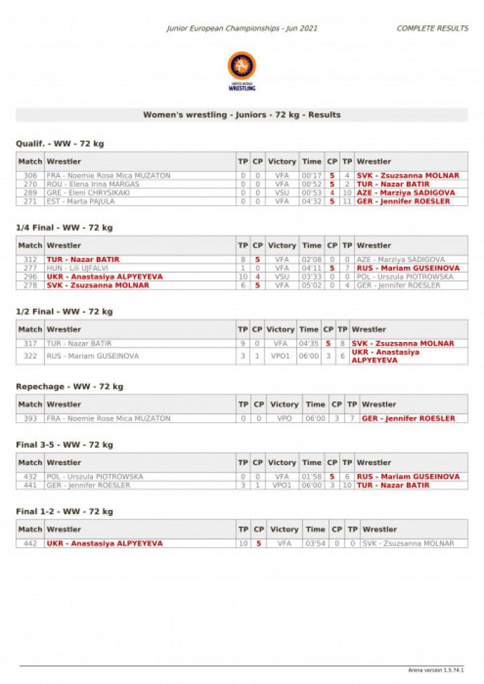 Україна посіла перше місце в командному заліку на Чемпіонаті Європи серед юніорок. Наші дівчата показали приголомшливий результат – 10 медалей у десяти категоріях. Золоті медалі завоювали Юлія Леськовець, Олександра Хоменець, Соломія Винник, Оксана Чудик, Манола Скобельська, Наталя Клівчуцька, Анастасія Алпєєва.
