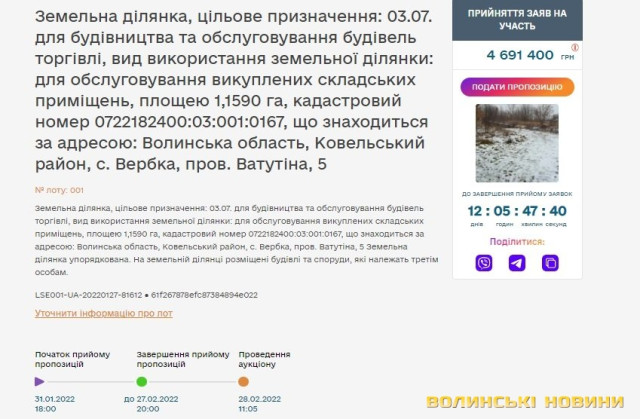 Земельну ділянку в рамках виконавчого провадження продають за 4,7 мільйона гривень. Оголошення про продаж земельної ділянки площею 1,1590 га в селі Вербка на провулку Ватутіна, 5 розміщено на сайті «Прозорро. Продажі». Це майже передмістя Ковеля. Кадастровий номер ділянки – 0722182400:03:001:0167, а її цільове призначення – для обслуговування викуплених складських приміщень.До слова, лот виставляють не вперше. У повідомленні також інформують, що на земельній ділянці розміщені будівлі та споруди, які належать третім особам.