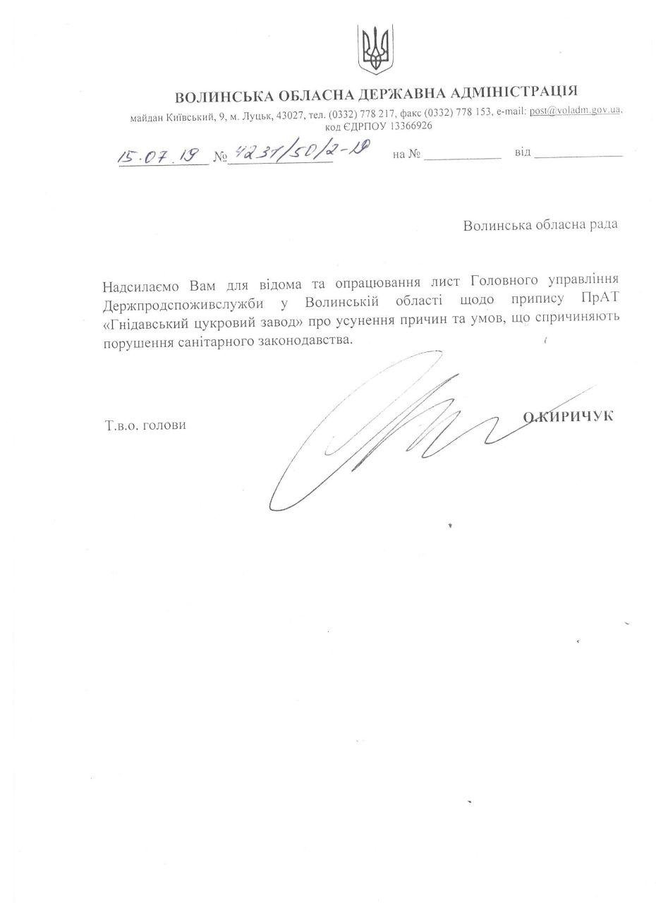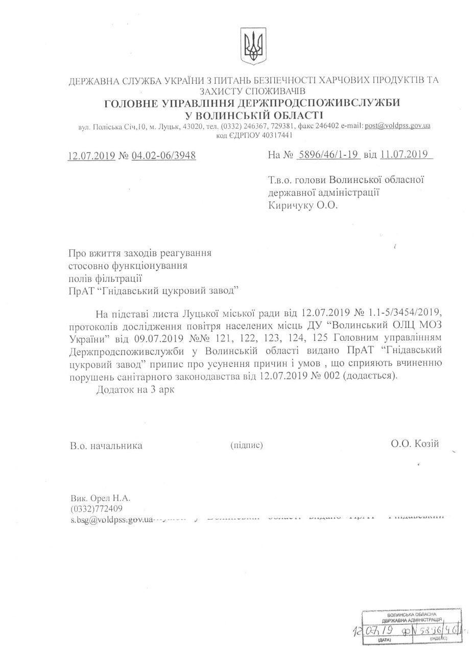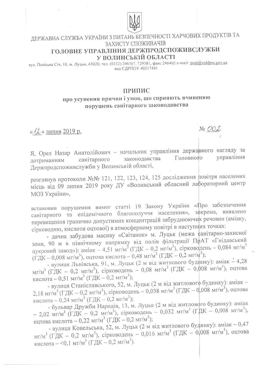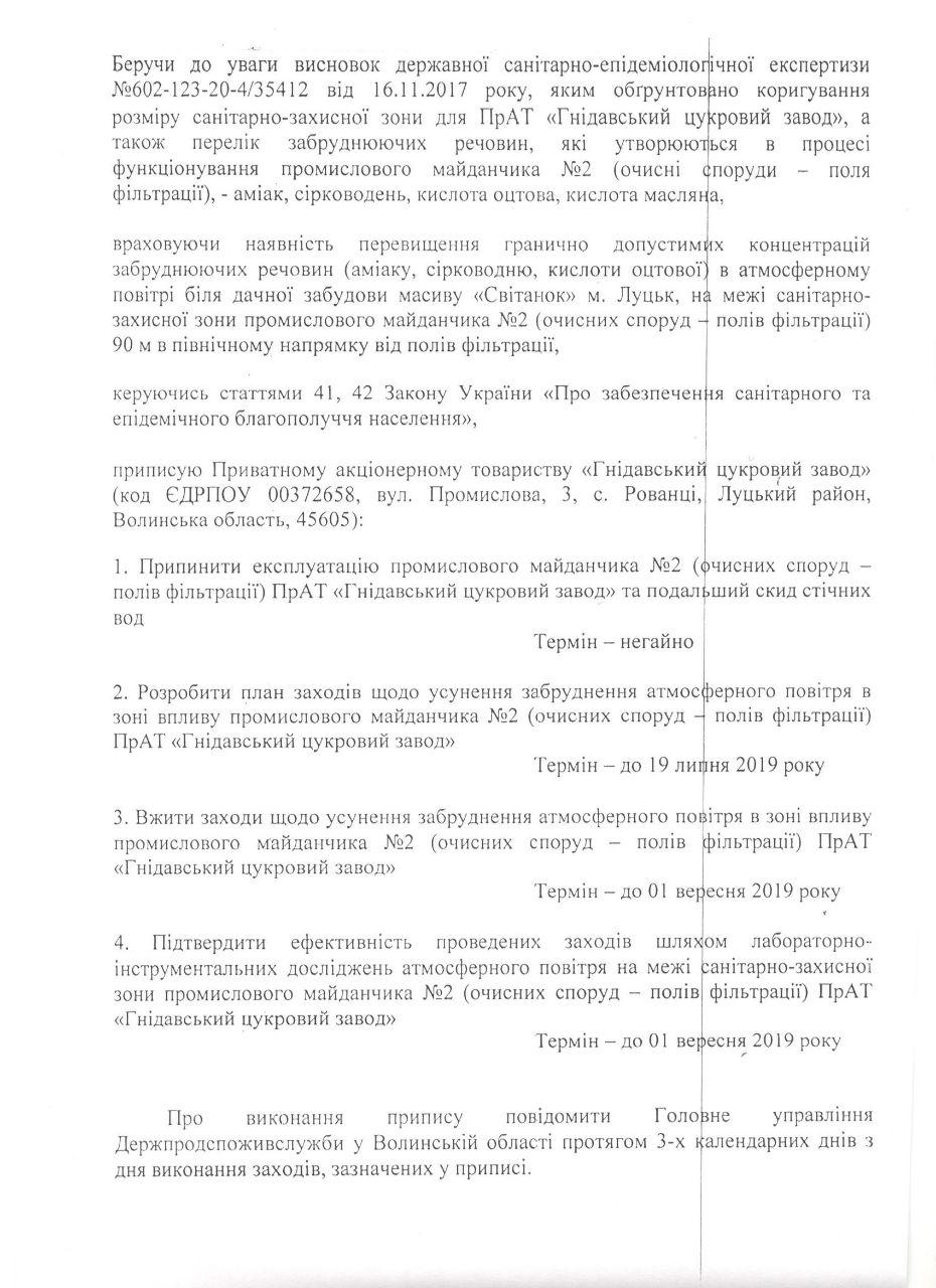 Як наслідок, головним управлінням Держпродспоживслужби у Волинській області видано негайний до виконання припис про припинення експлуатації полів фільтрації. В подальшому це зупиняє господарську діяльність Гнідавського цукрового заводу та підприємства «Біо Пек», – зазначив Дмитро Дубняк.З його слів, результатом виявлених порушень може стати повне відкликання усіх дозвільних документів на господарську діяльність підприємства.