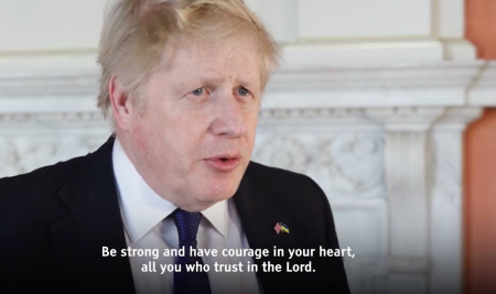«Будьте сильні і майте в серці одвагу, ви всі, що уповаєте на Господа», – сказав українською мовою Борис Джонсон.