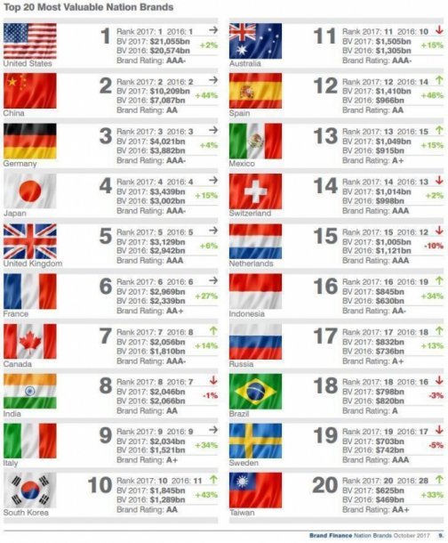 Найдорожчими брендами серед країн світу стали США (21 трлн доларів), КНР (10,2 трлн доларів), Німеччина (4 трлн доларів), Японія (3,4 трлн доларів) і Великобританія (3,1 трлн доларів).