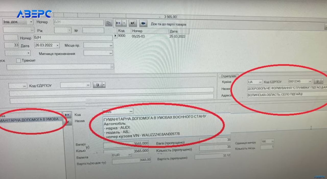 Броньовану Audi завозили як гуманітарну допомогу для добровольчого формування «Струмівка», яке пов’язували зі Смолкою. Проте цей автомобіль за актом приймання-передання подарували волинському прикордонному загону. І вже через три дні машині знайшли нового власника, йдеться в сюжеті ТРК «Аверс».