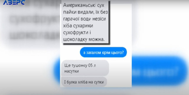 «Американські сухпайки видали, їх без гарячої води не з’їси, хіба сухарики і сухофрукти та ще шоколадку можна. Ще - тушонку 0,5 літра і буханку хліба на добу. Один радянський зажим і два бандажі з 80-го року», - пише він.