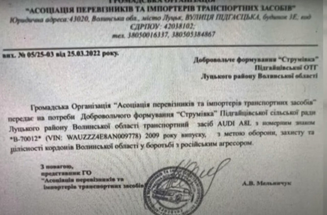 Документ про передачу авто підписав представник асоціації Андрій Мельничук. Допитатися, як це авто може пригодитися на випадок війни у Підгайцях фактично немає в кого.