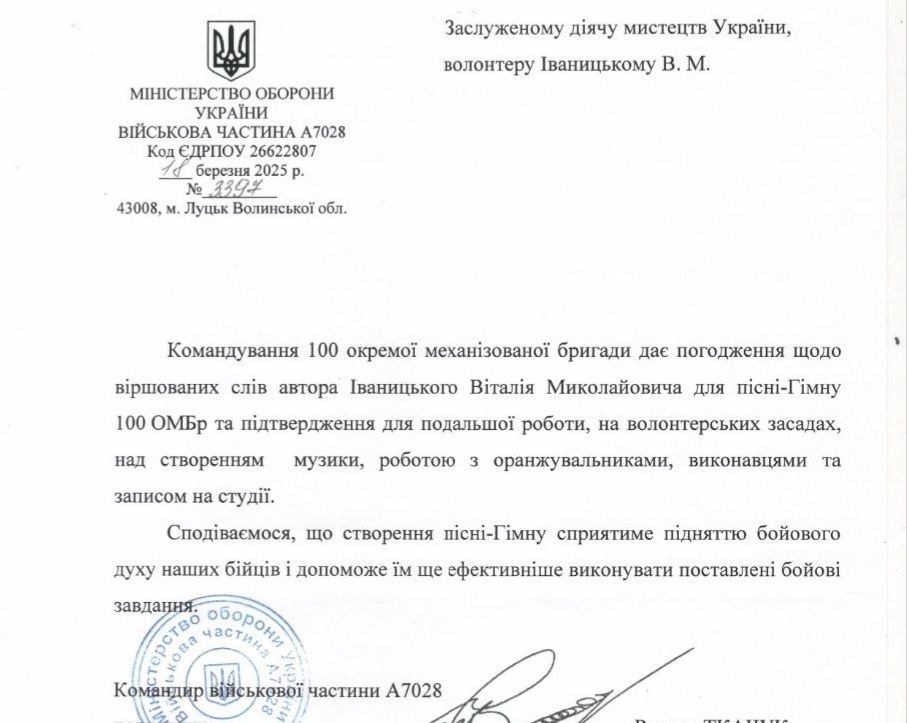 Головна вдячність – бійцям і командирам 100-ї бригади ЗСУ, усім воїнам, які захищають нашу країну від російського агресора. Нехай ця пісня стане символом і талісманом удачі та слави для кожного, хто служив, служить і буде служити у славній 100-й бригаді ЗСУ», – написав Віталій Іваницький.Читати ще: Із грудня 2023-го – у зоні бойових дій: сімох волинських військових нагородив Головнокомандувач ЗСУ