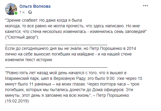 Журналістка Ольга Волкова процитувала на своїй сторінці в Facebook історію президента, супроводивши її цитатою з повісті Джорджа Орвелла «Колгосп тварин» – «Якщо до сьогодні ви не знали, але Петро Порошенко в 2014 особисто на собі виносив загиблих на майдані – і на нашій стіні змінили текст історії», – резюмувала журналістка.Народний депутат Семен Семенченко опублікував в Facebook фото президента в компанії правоохоронців і проіронізіровал: «2014. Порошенко готується виносити поранених» беркутами майданівців. Напруга боротьби і жертовність майбутнього президента України вражає.Політичний оглядач Руслан Бізя процитував у своєму Facebook анекдот про Вовочку і війну, в якому вчителька запитала у дітей, що вони робили під час німецької окупації, а Вовочка відповів, що підносив патрони "нашим".