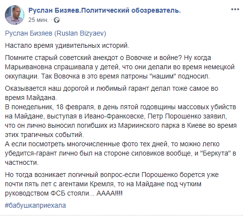 «Виявляється наш дорогий і улюблений гарант робив те ж саме під час Майдану... Якщо подивитися численні фото тих днів, то можна легко переконається – гарант особисто був на боці силовиків, і Беркута зокрема. Але тоді виникає логічне запитання – якщо Порошенко бореться вже майже п’ять років з агентами Кремля, то на Майдані під чуйним керівництвом ФСБ стояли», – написав Бізя."Він – чує плач дітей через броньоване скло машини кортежу! Він – виносив мертвих з Майдану! Він – духовний батько української нації. Телефонуйте в 103, тут пацієнт для каральної сорочки", – такий пост опублікувала в своєму Facebook журналістка Олеся Медведєва, супроводивши його хештегом "PoRoshenKoNeverAgain".Політичний експерт Микола Мельник зазначив, що очікував заяв порохоботів з приводу подвигів Порошенка на Майдані.