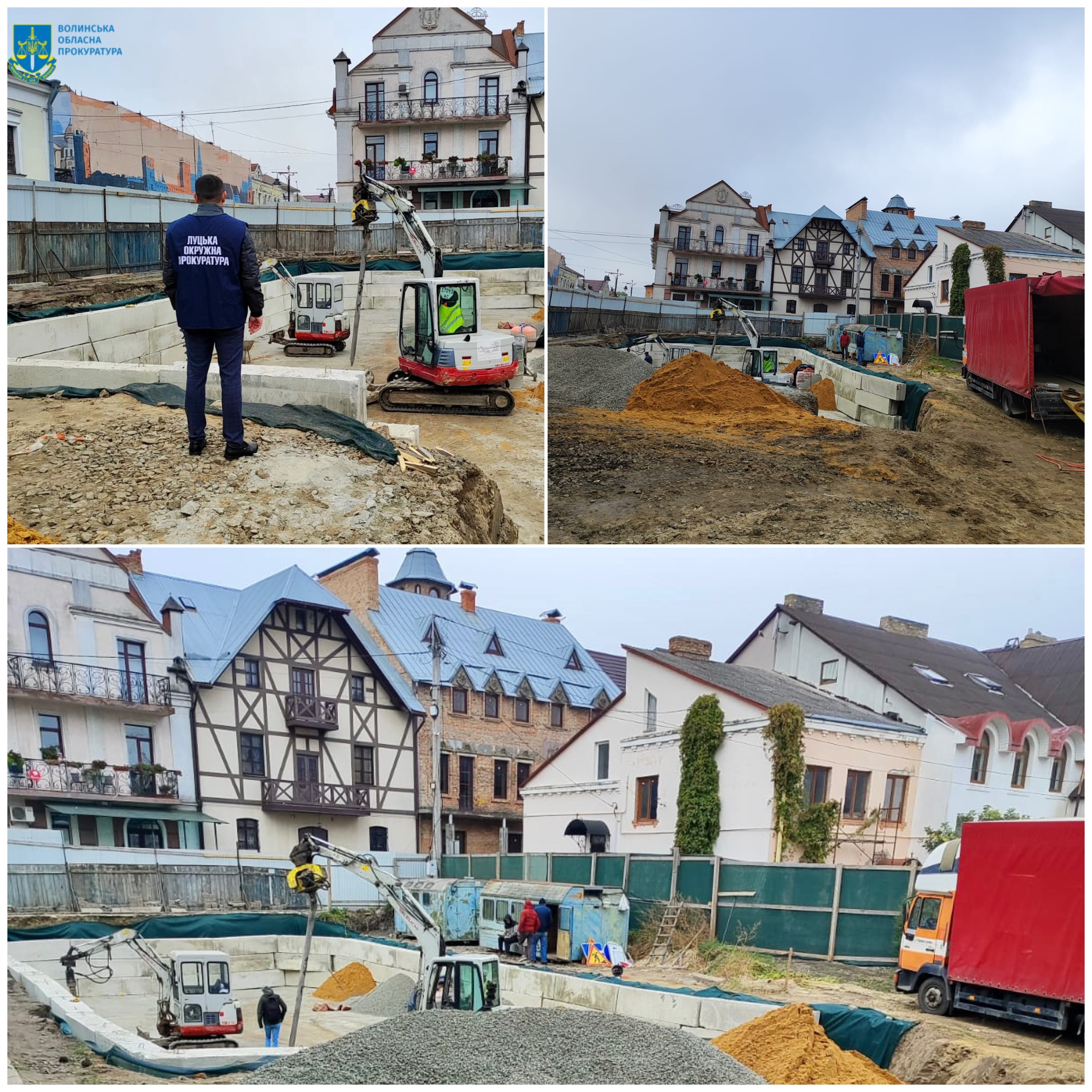 У прокуратурі констатують: суб’єкт господарювання проводить будівельні роботи на земельній ділянці, розташованій на вулиці Кафедральній, 13 в Луцьку в межах історико-культурного заповідника «Старий Луцьк». 24 жовтня у ході досудового розслідування кримінального провадження із залученням спеціалістів проведено огляд місця події – земельної ділянки, де здійснюється будівництво. Встановлено, що на ділянці є котлован, нижня частина якого залита бетонно-фундаментною підготовкою, окрім цього, наявні технологічні отвори в нижній частині котловану.