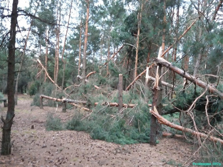 В Олександра Тарасюка (його будинок крайній від лісопосадки, де вирував буревій), зірвало з даху 20 шиферин. Навколо і далі по селі теж зламало, але вже поодинокі дерева.