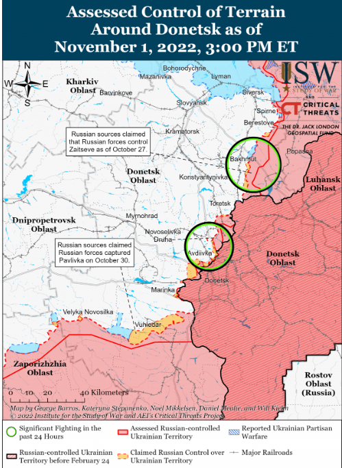 Так, як наголошують аналітики, напередодні у зведенні Генеральний штаб ЗСУ зазначив, що російські окупаційні сили наступають на Бахмутському та Авдіївському напрямках. Сили оборони намагаються утримувати позиції поблизу Бахмута, тоді як противник з артилерії гатить по населених пунктах на лінії зіткнення, зокрема Авдіївці, пише УНІАН.