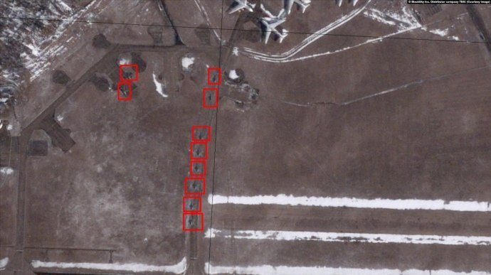 На аеродромі можна помітити, зокрема, 19 винищувачів, щонайменше 20 військових гелікоптерів. А також військово-транспортні літаки АН-124 та ІЛ-76, які там постійно базуються.