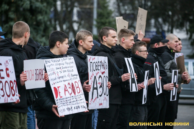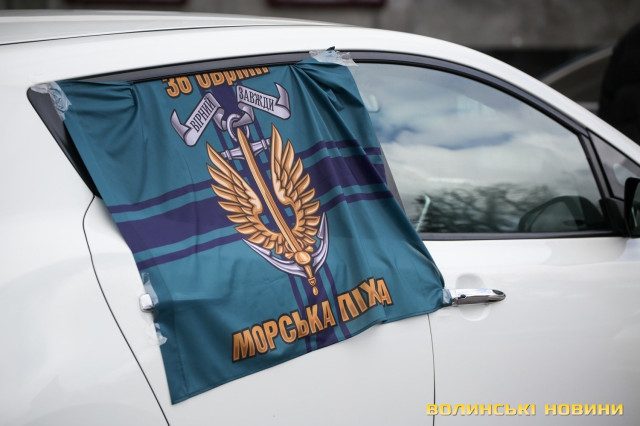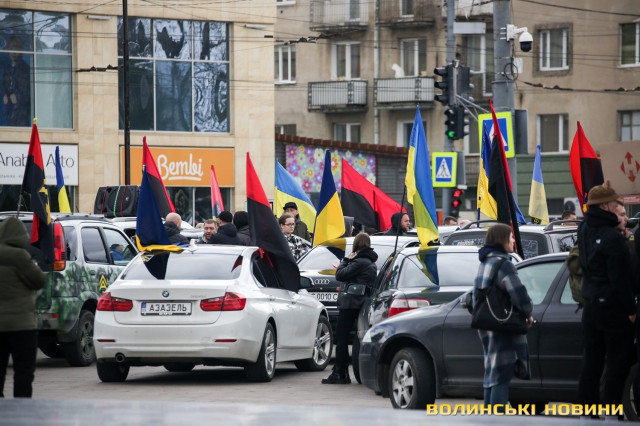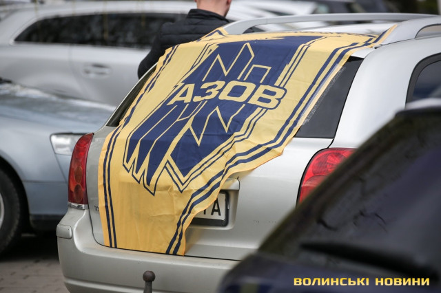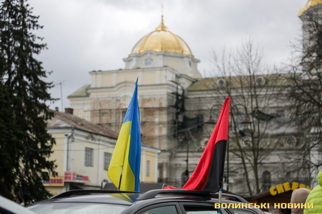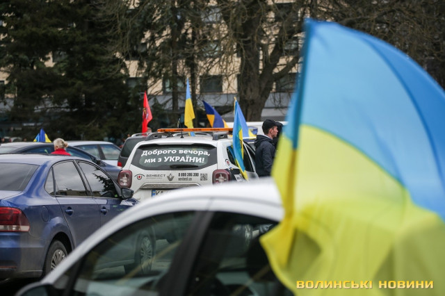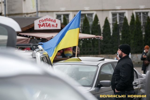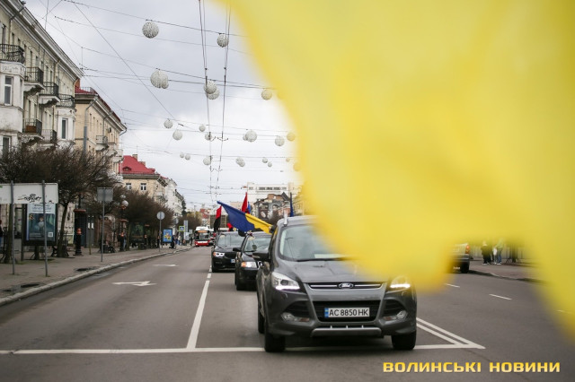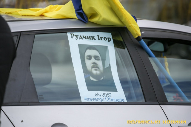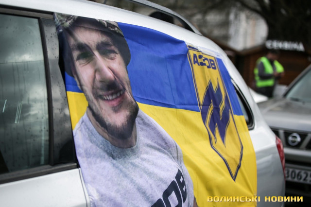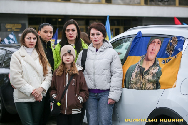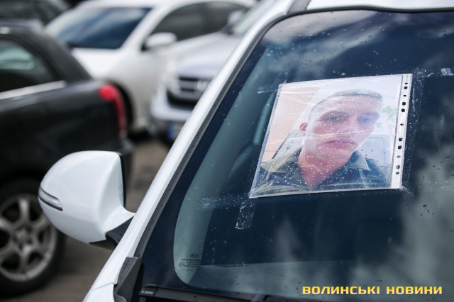 Центр Луцька сьогодні нагадав містянам про війну: поки поблизу фотостенду «Герої Небесної Сотні – загинули за єдність України» прощалися з полеглим захисником Артемом Павлюком, з іншої сторони Театрального майдану шикувалися на своїх авто родичі, близькі та друзі воїнів, які нині перебувають у російському полоні.