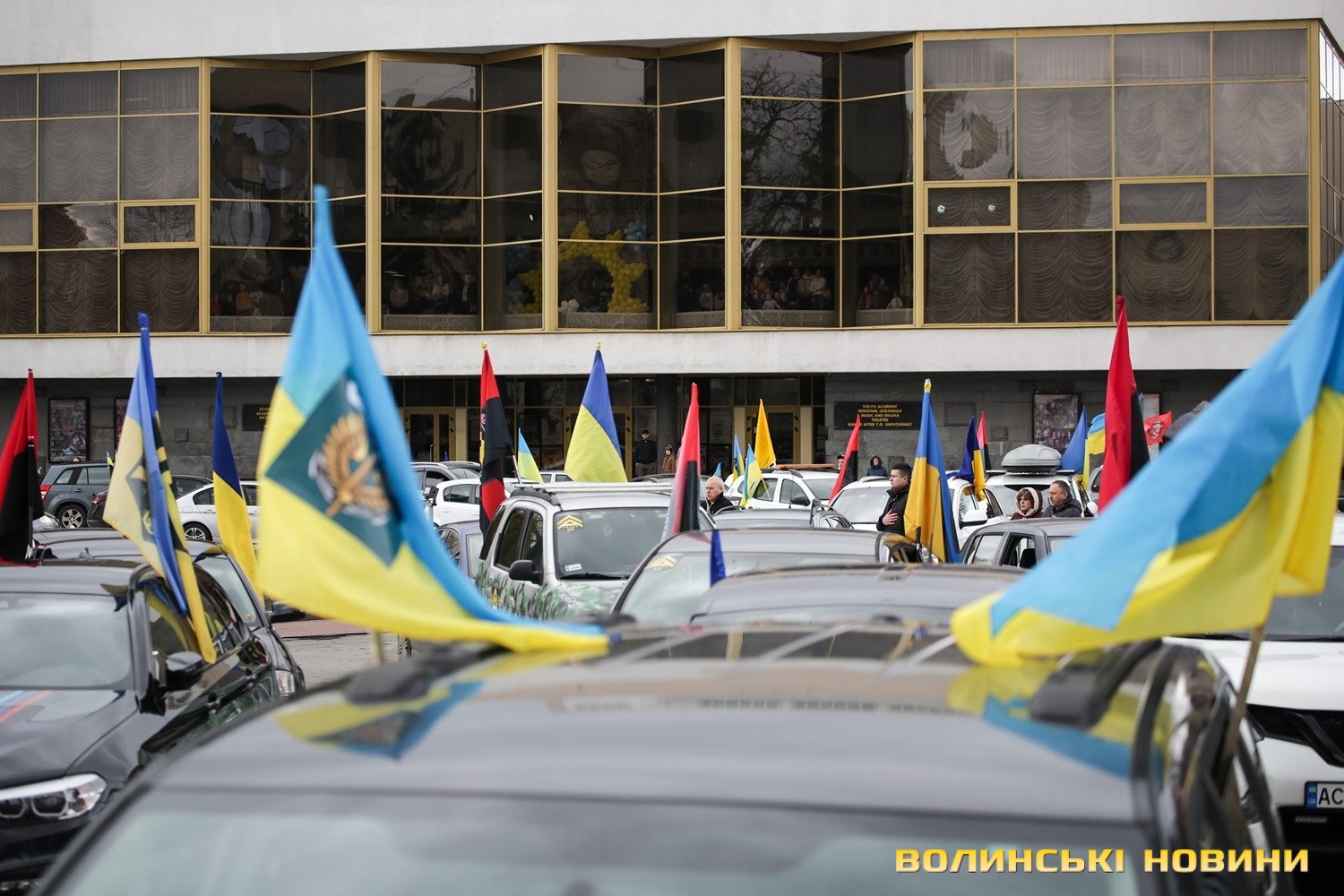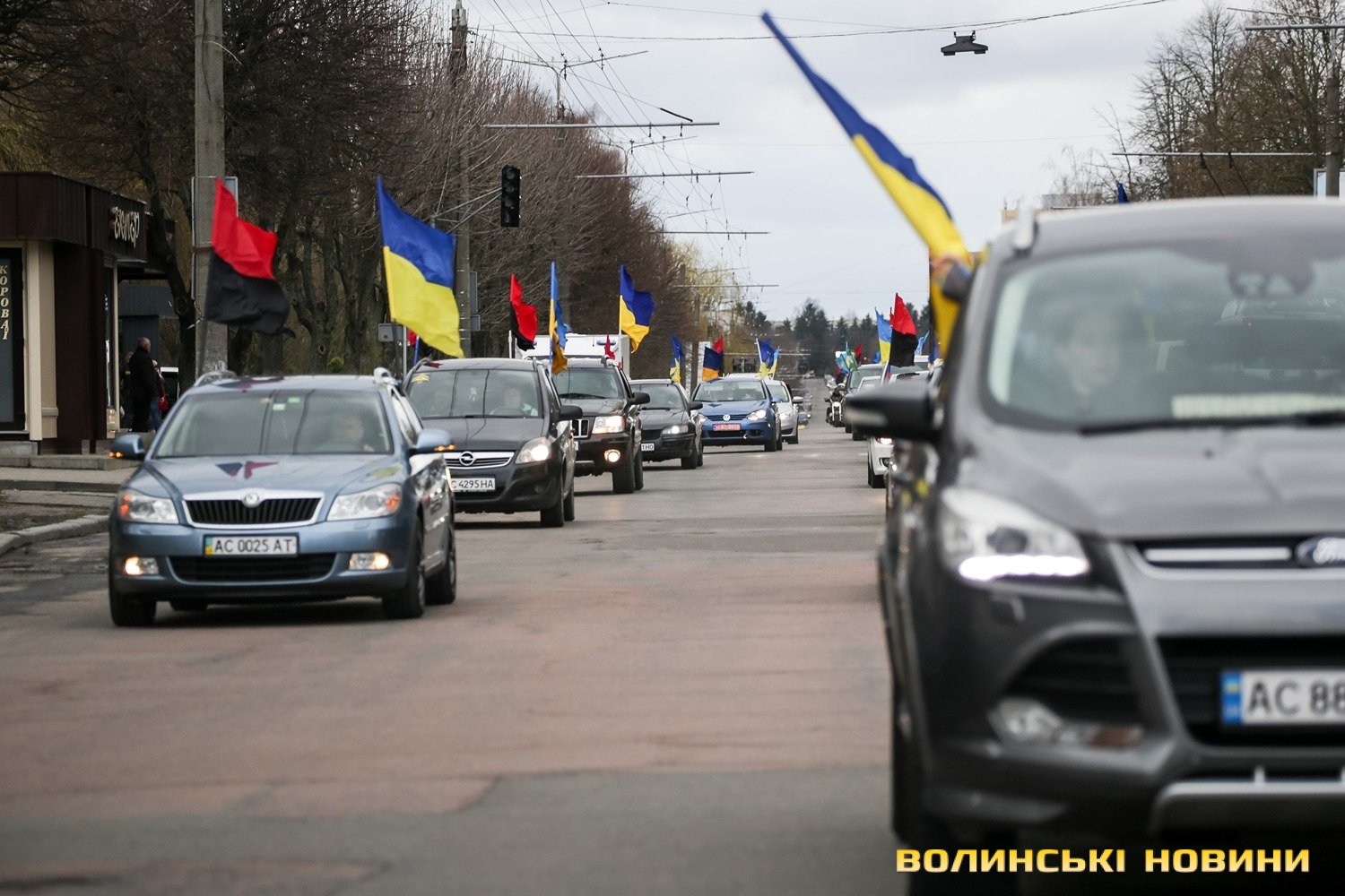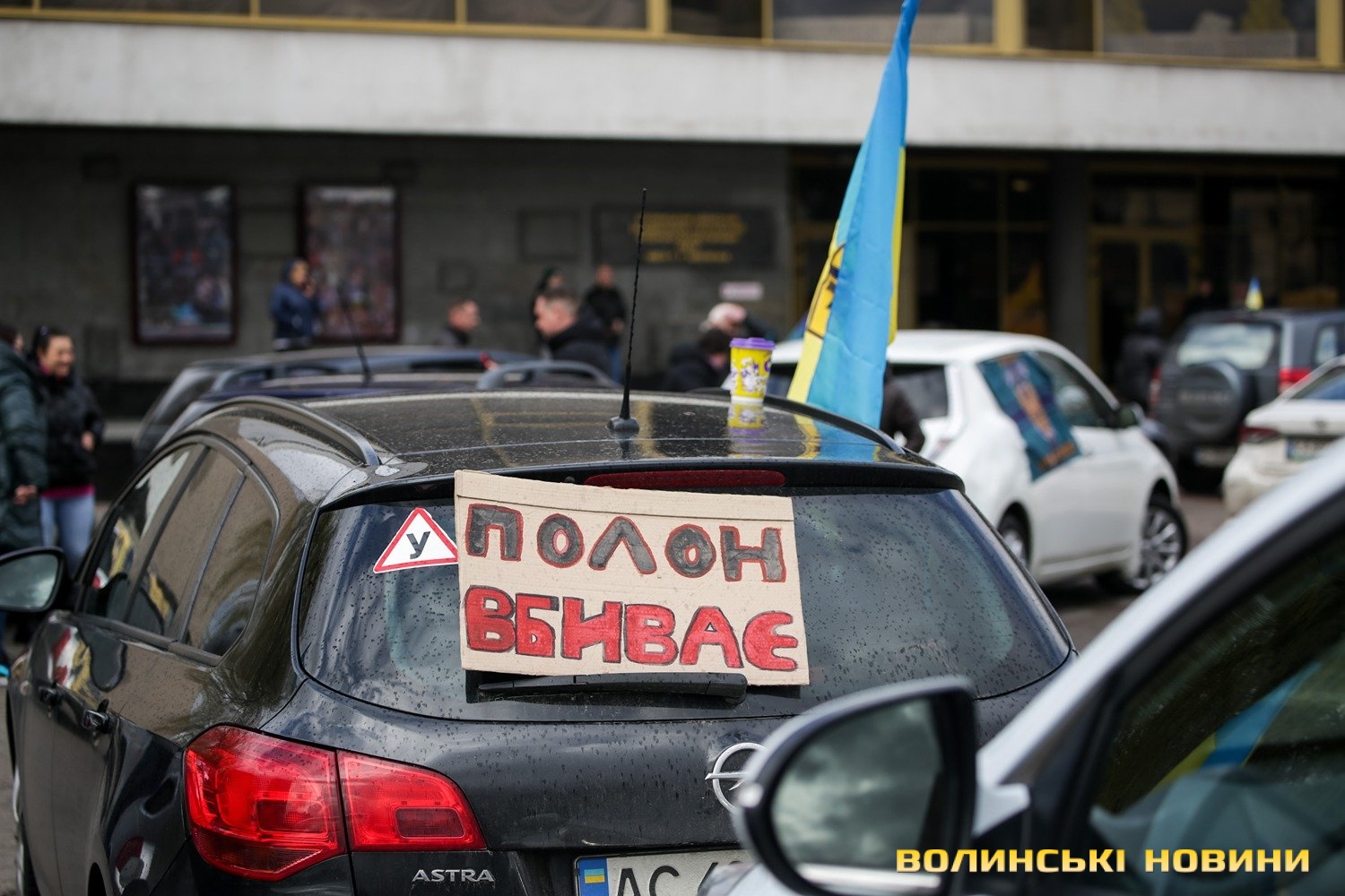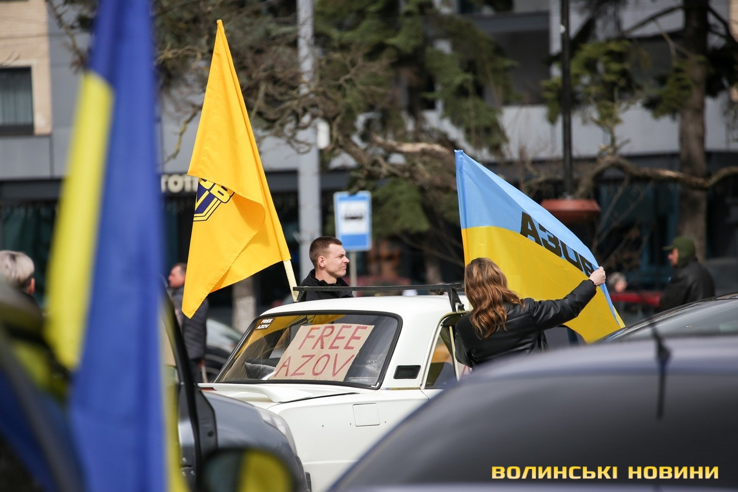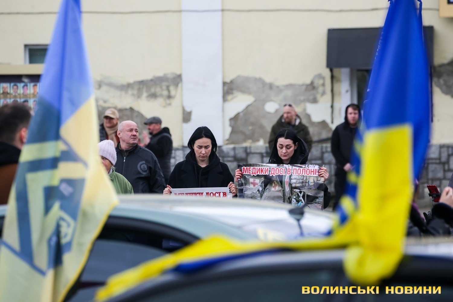 Центр Луцька сьогодні нагадав містянам про війну: поки поблизу фотостенду «Герої Небесної Сотні – загинули за єдність України» прощалися з полеглим захисником Артемом Павлюком, з іншої сторони Театрального майдану шикувалися на своїх авто родичі, близькі та друзі воїнів, які нині перебувають у російському полоні.