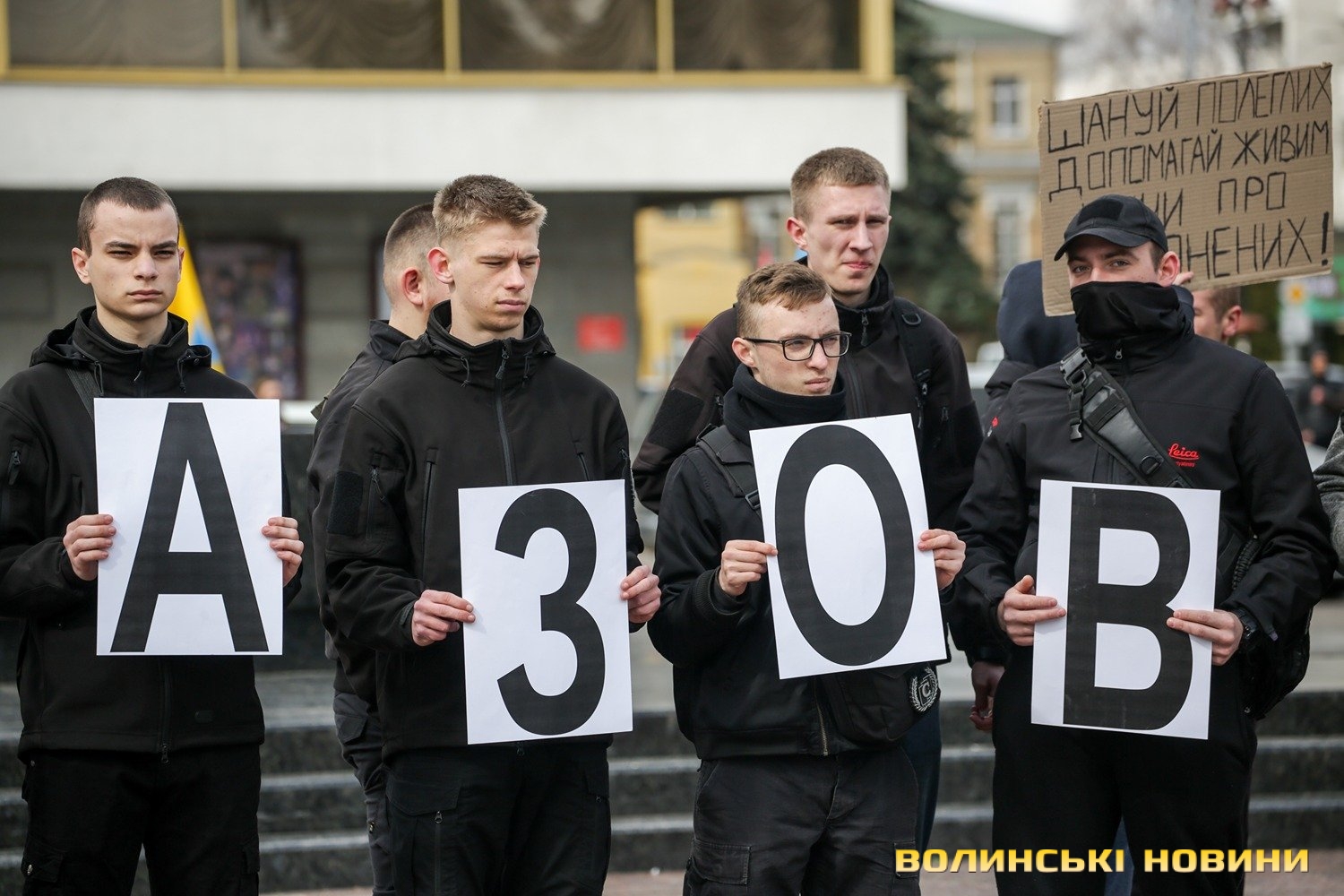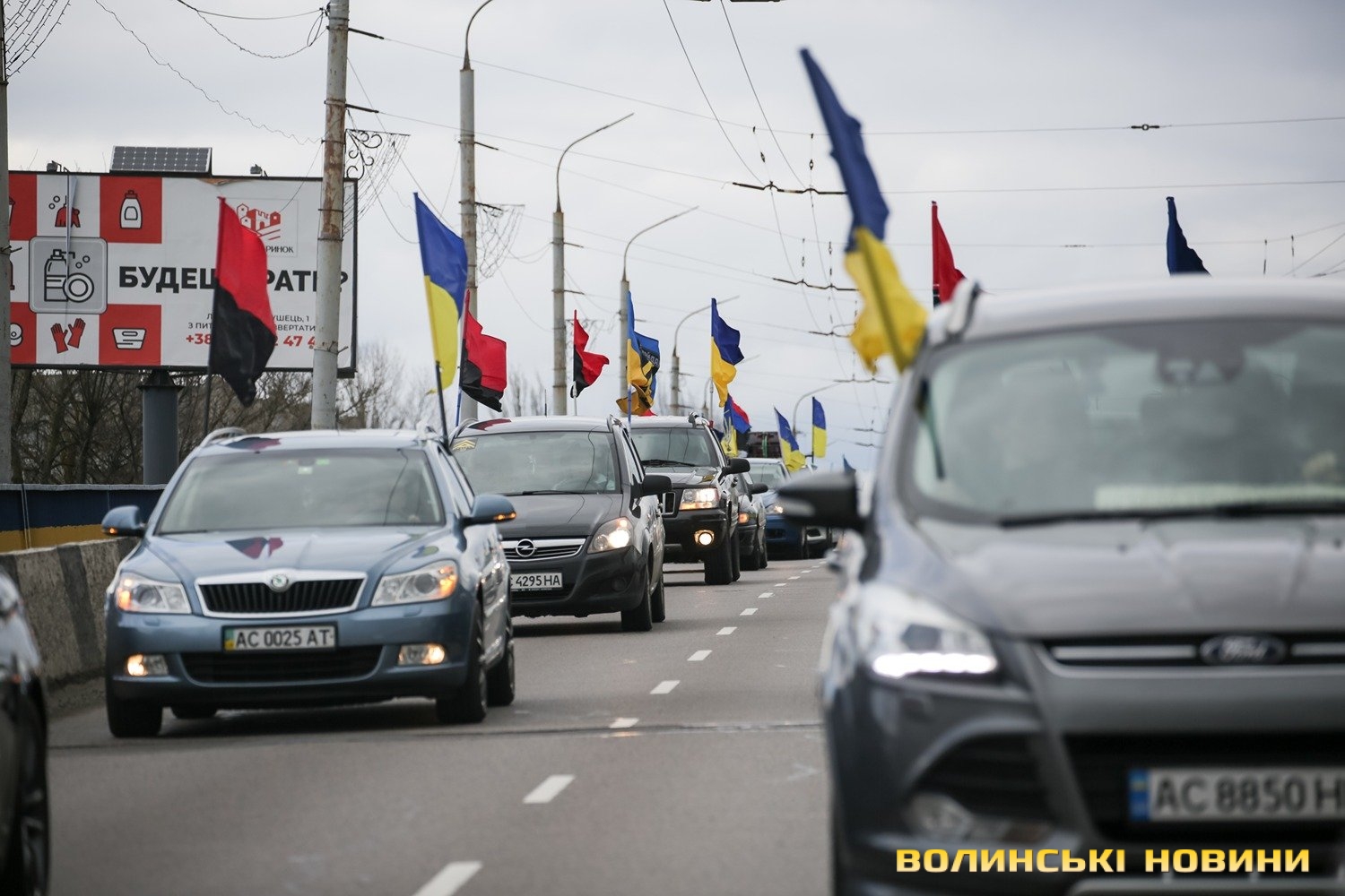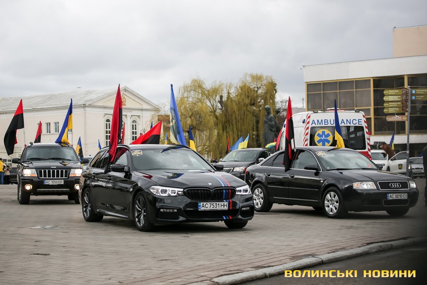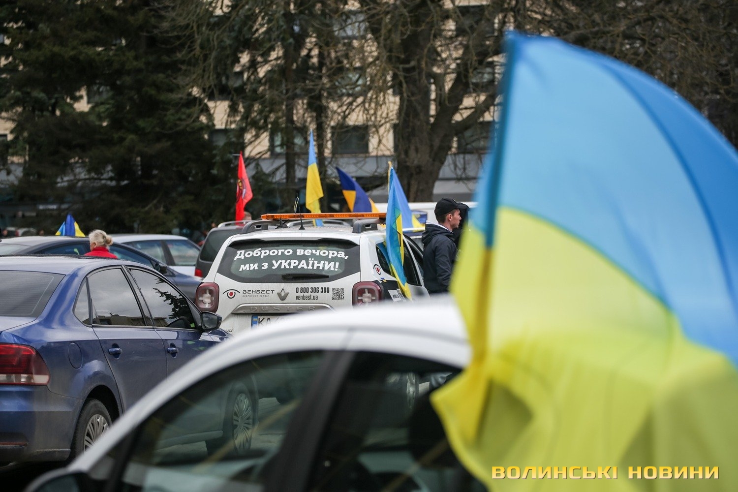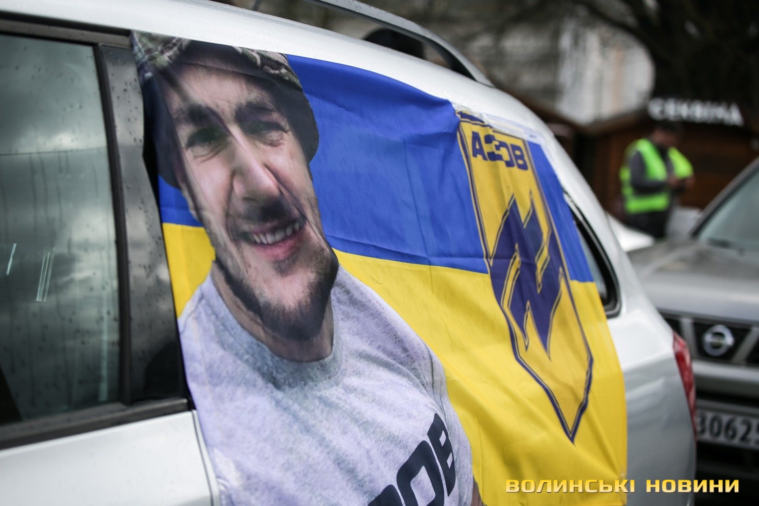 Центр Луцька сьогодні нагадав містянам про війну: поки поблизу фотостенду «Герої Небесної Сотні – загинули за єдність України» прощалися з полеглим захисником Артемом Павлюком, з іншої сторони Театрального майдану шикувалися на своїх авто родичі, близькі та друзі воїнів, які нині перебувають у російському полоні.