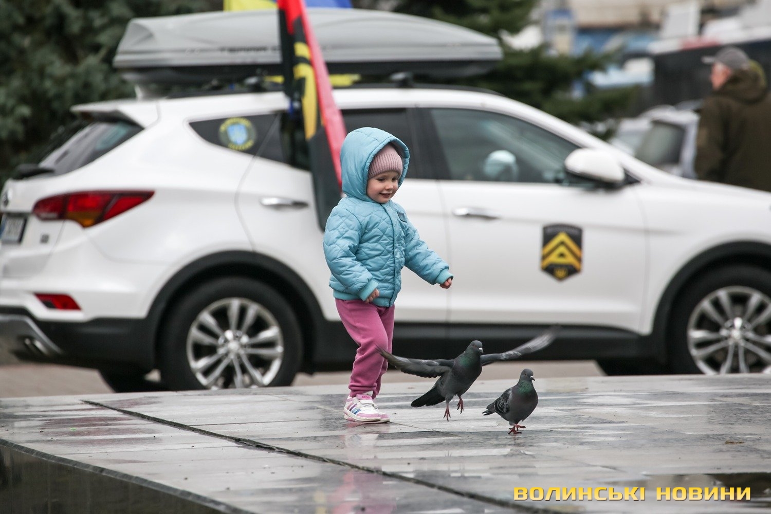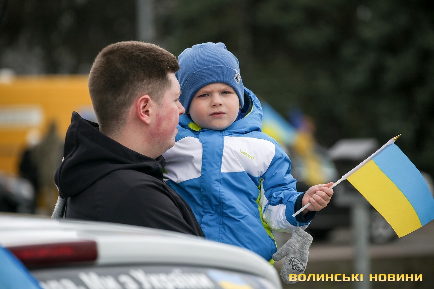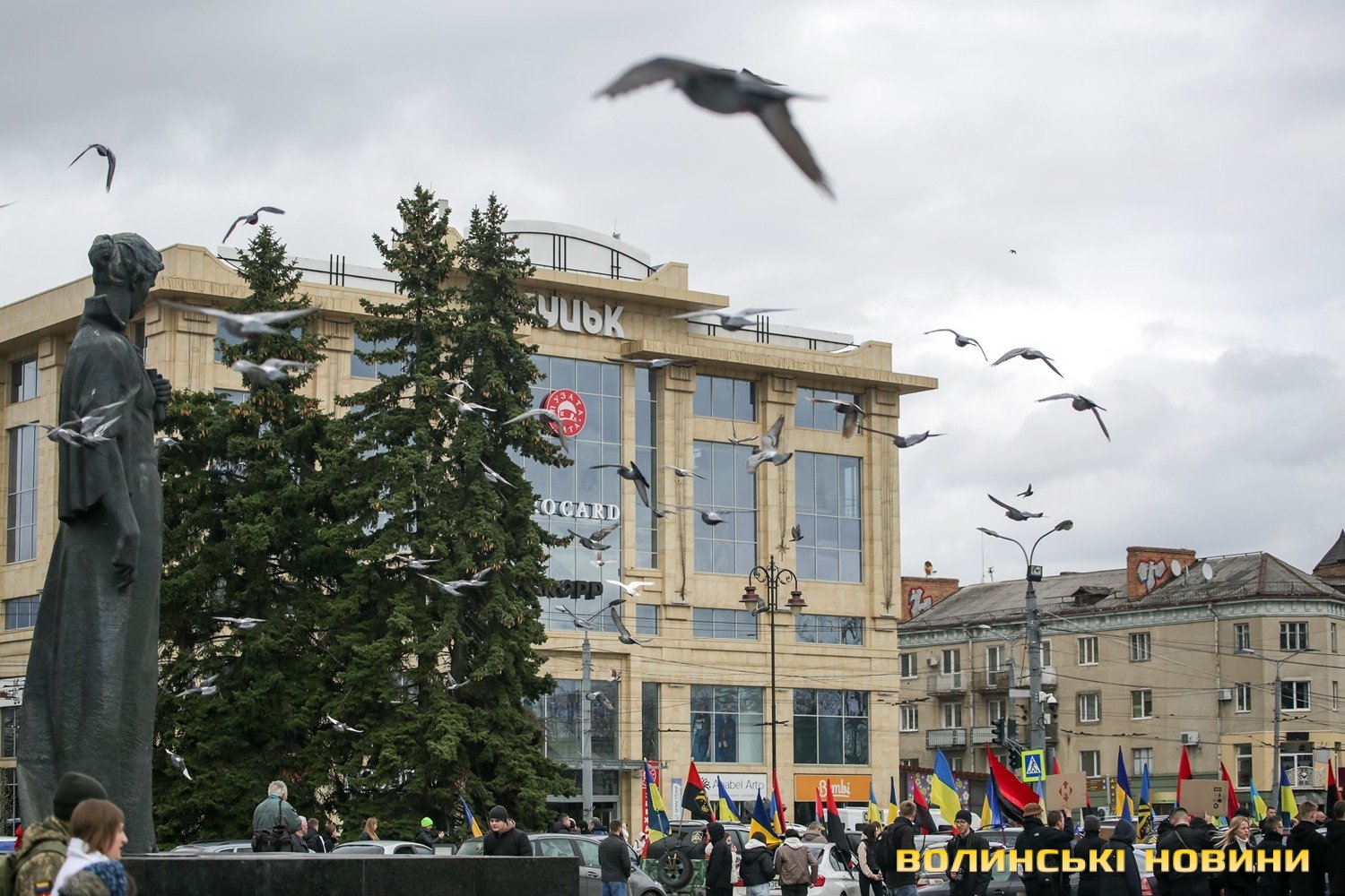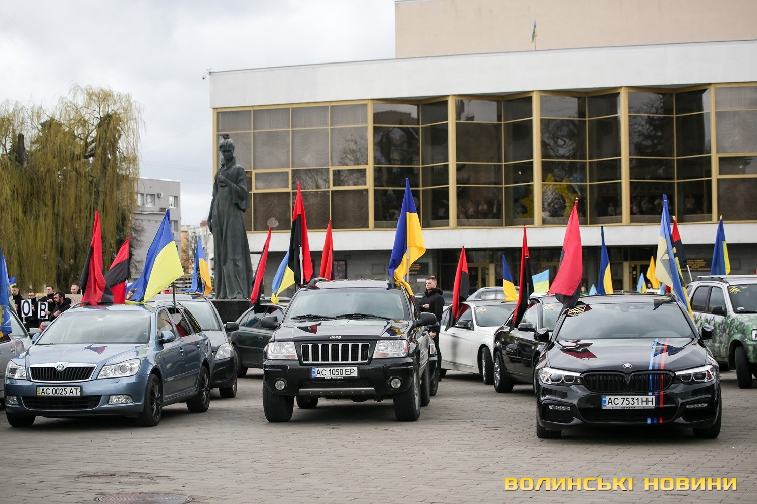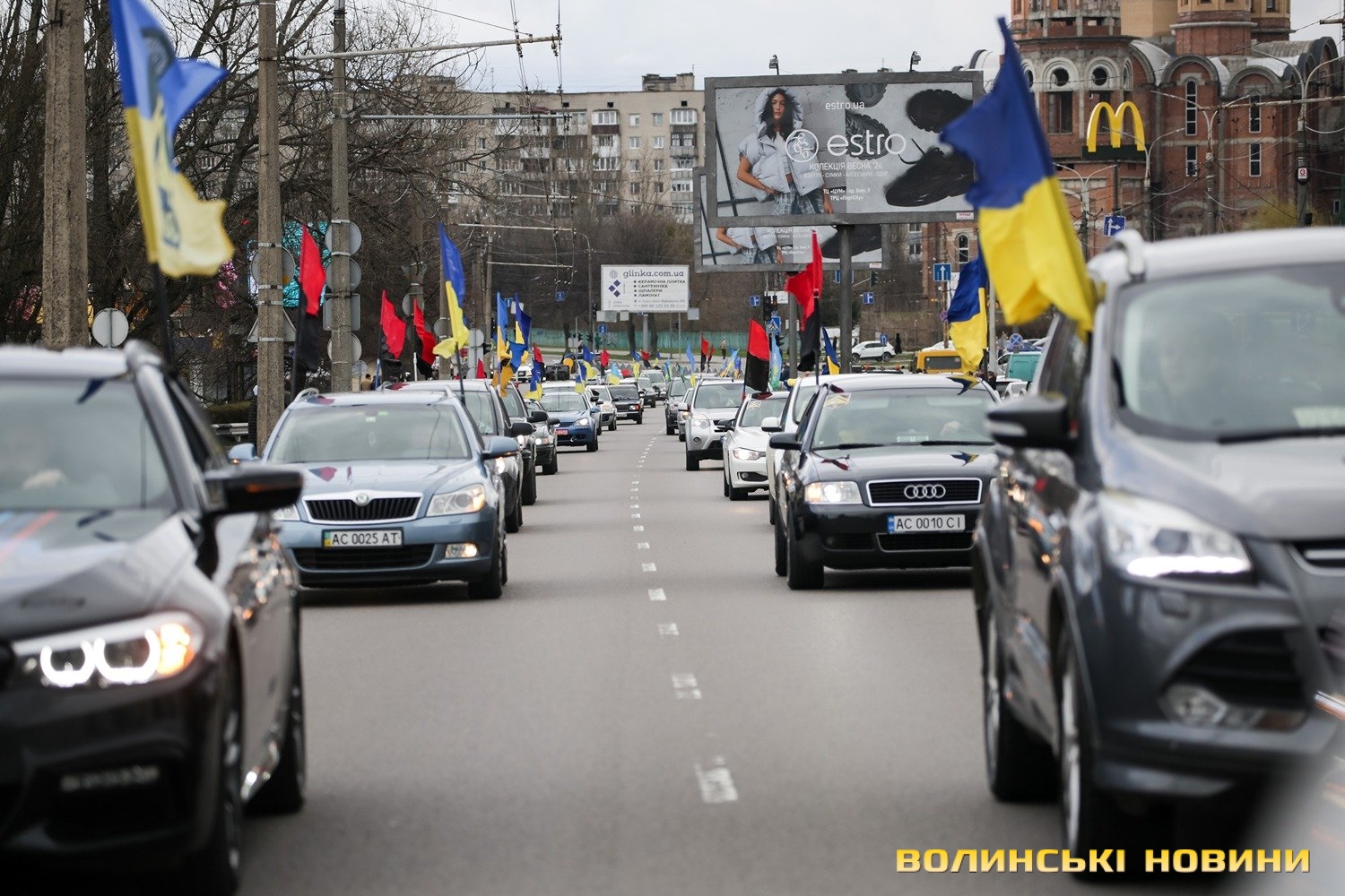 Центр Луцька сьогодні нагадав містянам про війну: поки поблизу фотостенду «Герої Небесної Сотні – загинули за єдність України» прощалися з полеглим захисником Артемом Павлюком, з іншої сторони Театрального майдану шикувалися на своїх авто родичі, близькі та друзі воїнів, які нині перебувають у російському полоні.