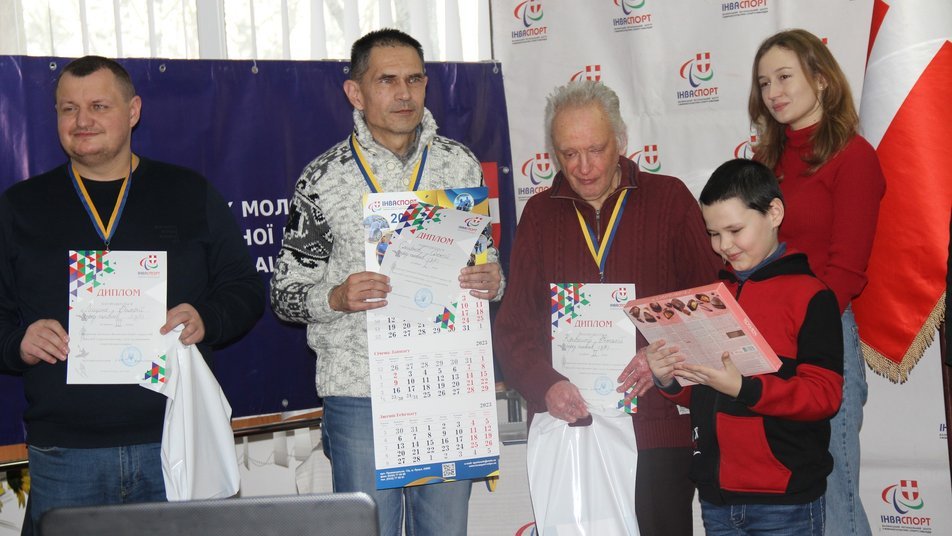 «Закінчився березень – ракет більше, руйнувань більше, смертей більше. Твої діти – вони не мають права там бути, і хочеться тобі там чи не хочеться, але в тебе є відповідальність за своїх дітей, які мають право спокійно спати», – розповідає дружина чемпіона Олена.Олексій Смирнов розповідає, що до повномасштабної війни в Луцьку бували двічі. Переїхати сюди їм допоміг тренер національної збірної України із шахів серед людей з інвалідністю по зору Дмитро Мударісов, який залишив Бахмут кілька років тому.Олексій Смирнов другий зліва. Під час нагородження у шашковому турнірі у Луцьку.