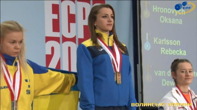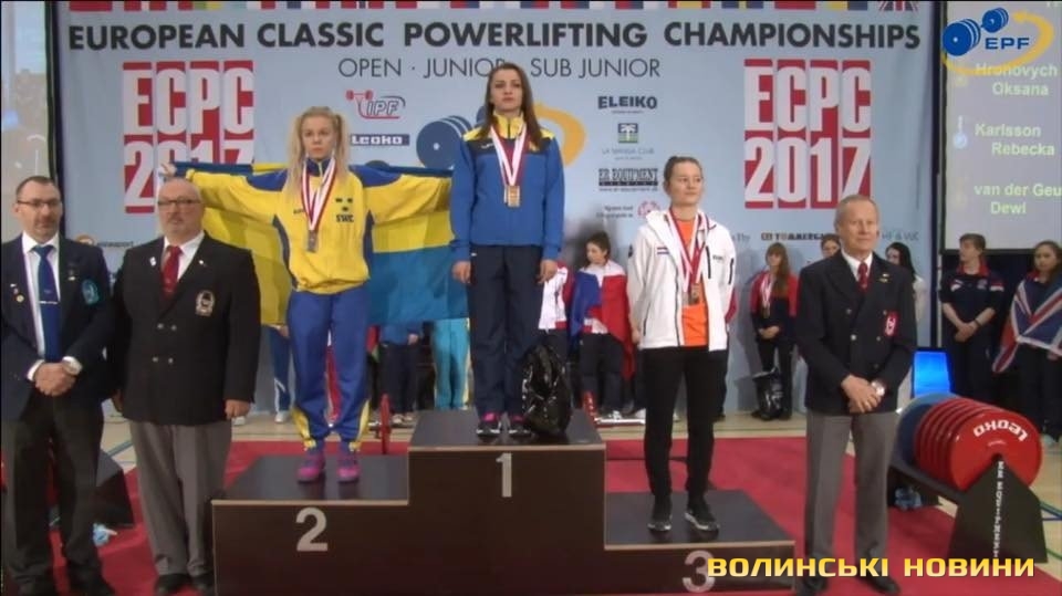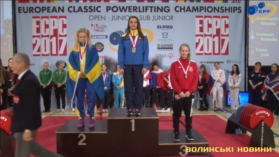 Оксана Гронович з Луцька завоювала золоту нагороду у сумі триборства у ваговій категорії 52 кілограми на Третьому чемпіонаті Європи серед юніорів з класичного пауерліфтингу, що зараз відбувається у місті Тістед (Данія).